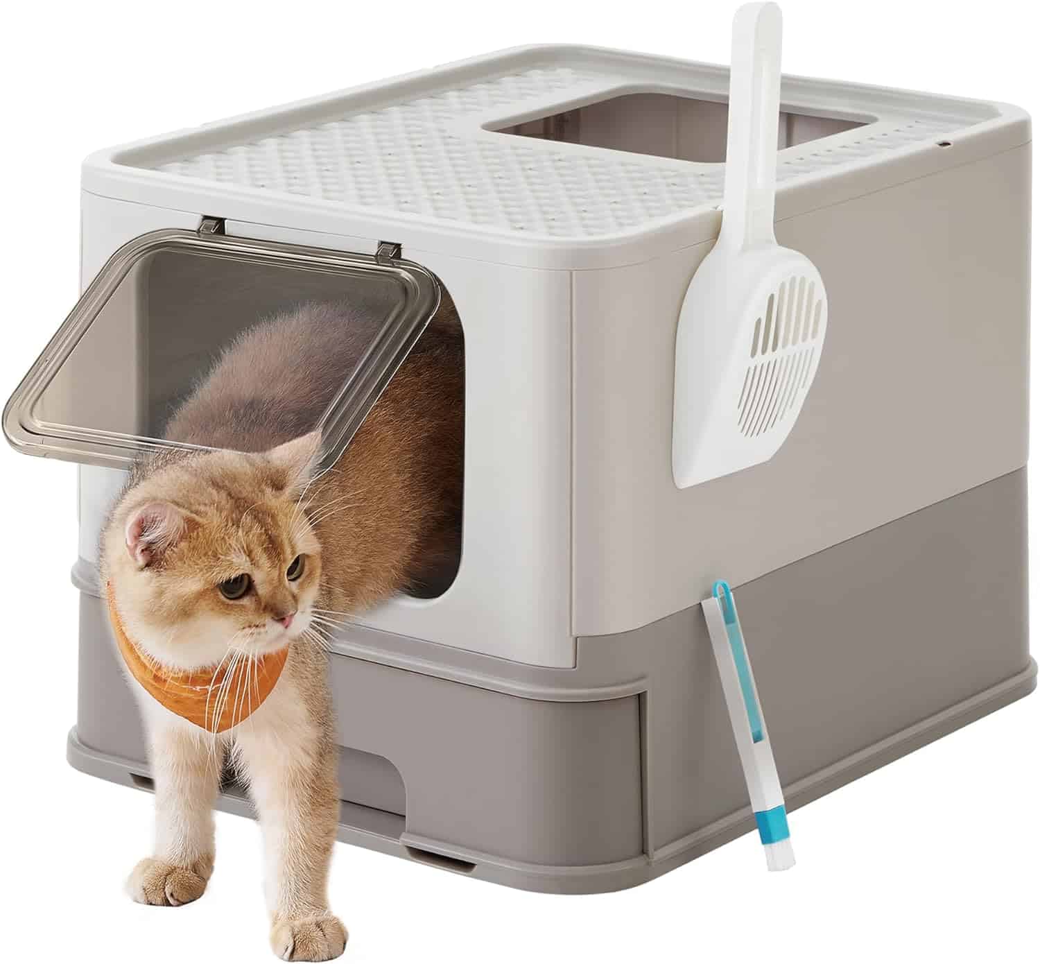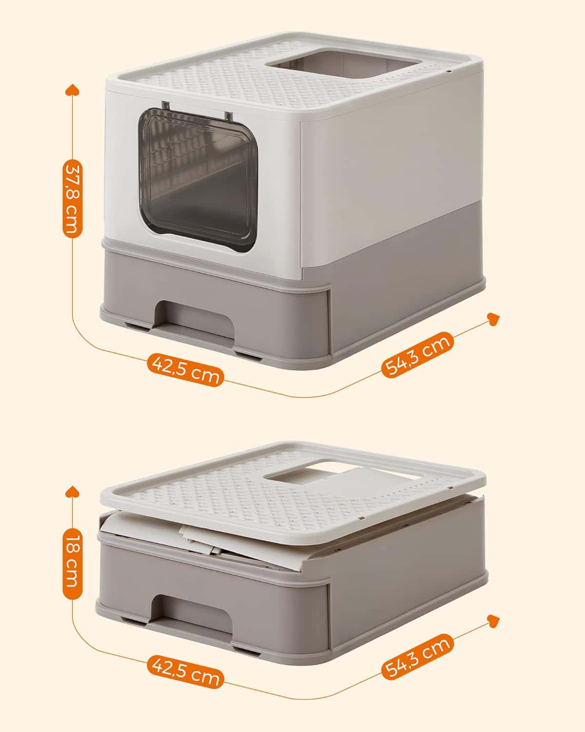 Detalii despre produs: Detalii despre produs: Culoare: Gri cald Material: PP (polipropilena), PC (policarbonat) Dimensiuni: 54,3 x 42,5 x 37,8 cm (L x l x i) Greutate: 3,4 kg Capacitate maxima de incarcare statica pe partea superioara: 15 kg Despre acest articol Mai putina mizerie: Designul cu grila din partea superioara reduce formarea urmelor si permite ca gunoiul sa cada inapoi in cutie. Acest lucru reduce formarea de urme in casa si va mentine casa curataMarginea extinsa deasupra cutiei si fundul inchis dedesubt impiedica scurgerea nisipului pe podea. Un ajutor practic daca pisicii dvs. ii place sa sape. Dimensiunea interioara a tavii este de 50 x 40,5 x 34,5 cm si ofera astfel suficient spatiu pentru pisicile mari. Poate sustine pana la 15 kg.Usa poate fi reglata astfel incat sa se deschida doar pe o parte, iar deschiderea de sus poate fi folosita ca iesire. De asemenea, usa poate fi deschisa pe ambele parti – in functie de nevoile dumneavoastra. Daca pisica dvs. este incepatoare, puteti, de asemenea, sa scoateti usa.Datorita designului pliabil si a instructiunilor usor de urmat, noua litiera pentru pisici a prietenului dvs. este gata in 5 minute sau mai putin.
