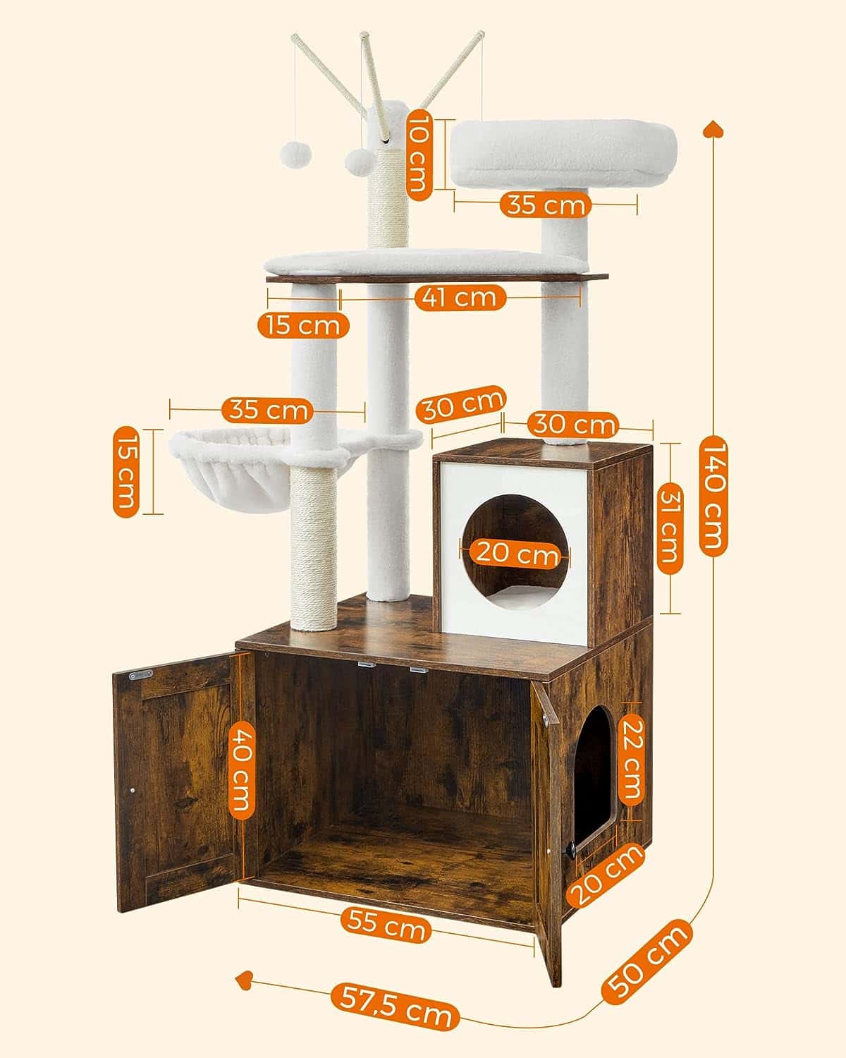 3 stalpi detasabili de plus, stalpi din sisal, o platforma superioara bine captusita, o pestera dragalasa pentru pisici si o zona de dormit pufoasa – cu acest stalp de zgariat, pisicile tale nu se vor plictisi.Datorita constructiei inchise, aceasta cutie pentru pisici ofera un loc privat in care pisica ta se simte in siguranta pentru a-si face nevoile.