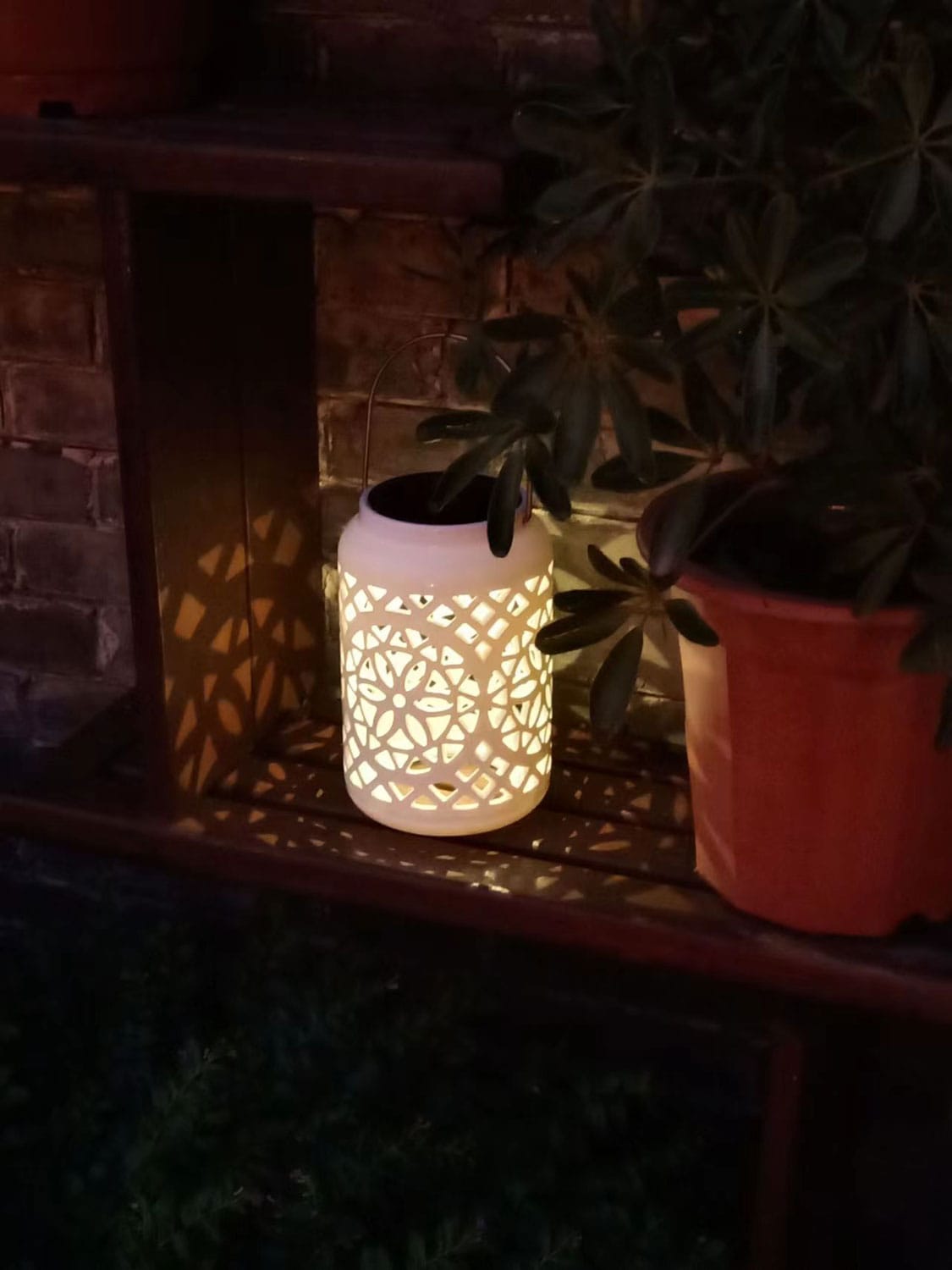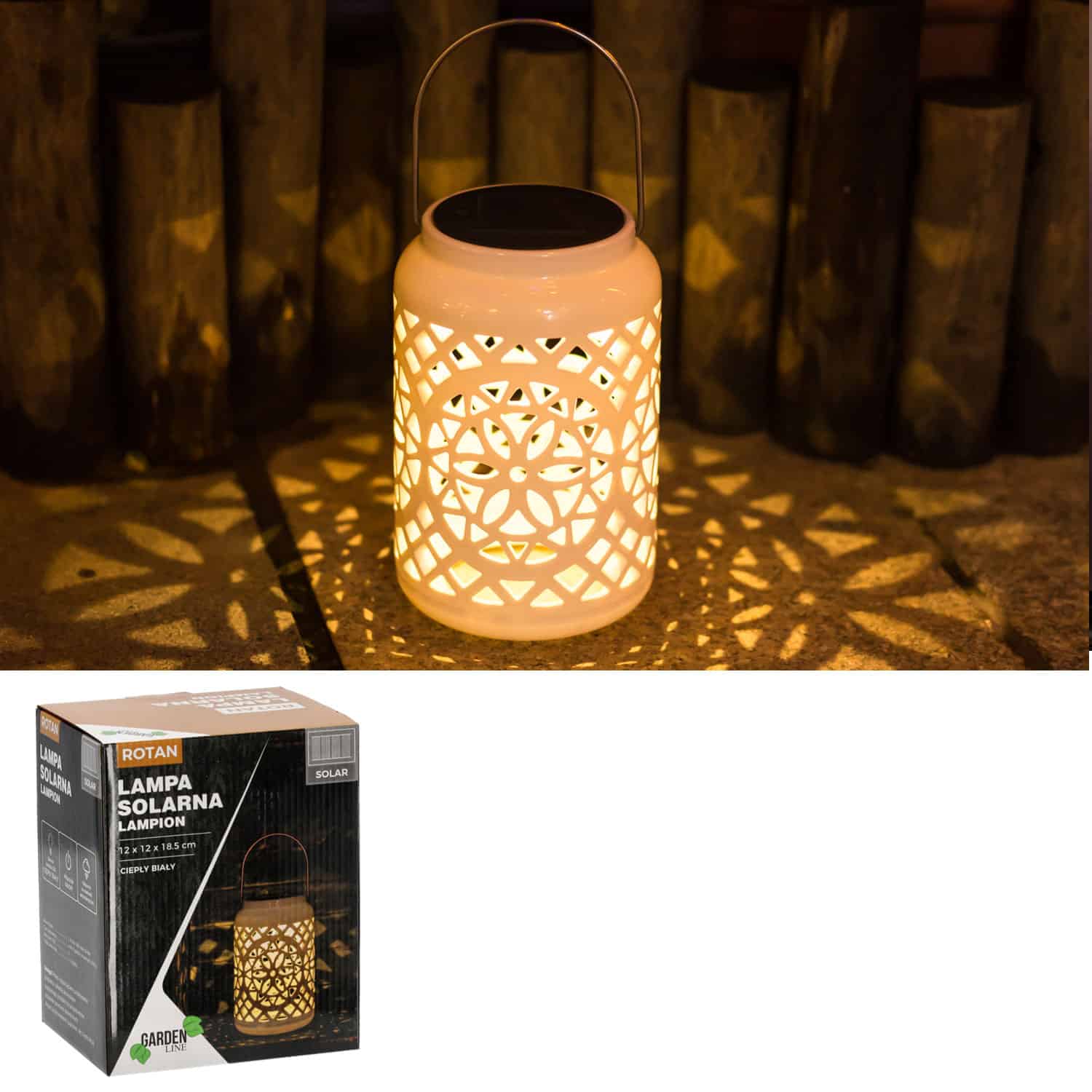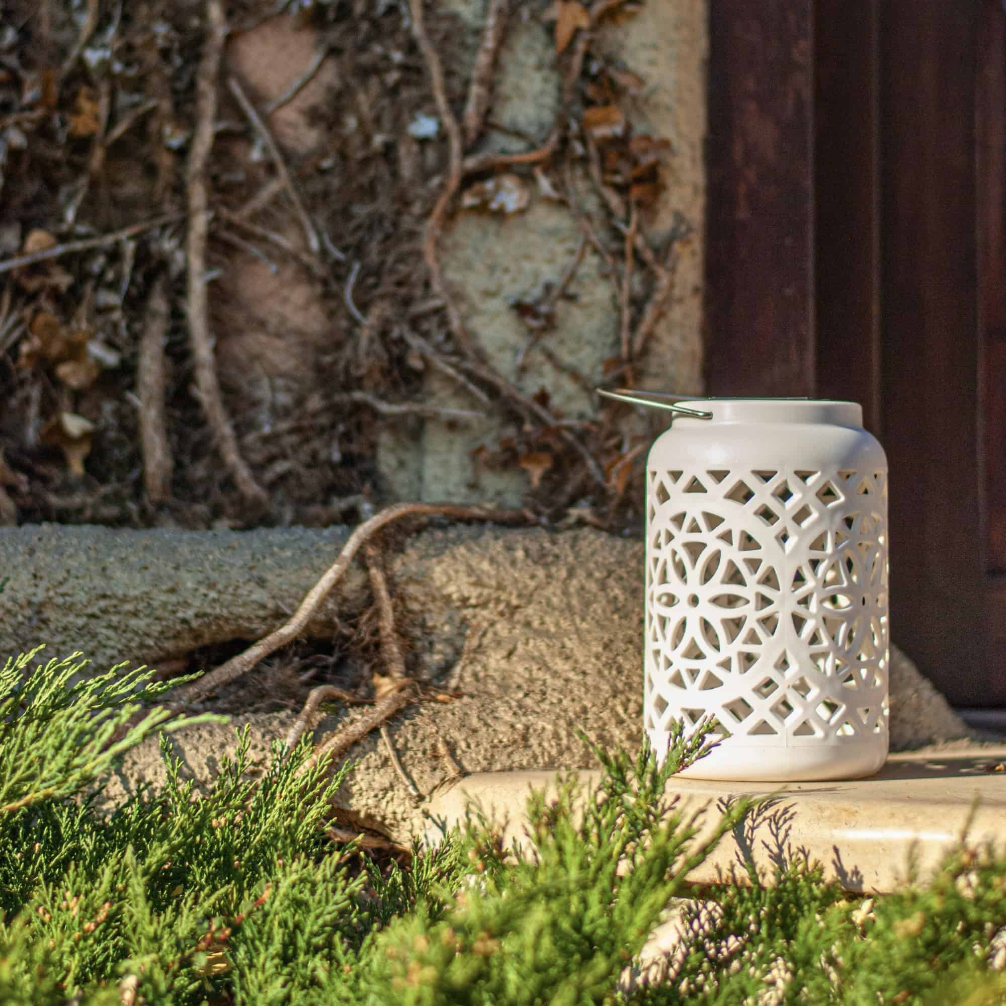 Felinar decorativ de vara, alb metalic cu model floral perforat si maner de agatat. Asaza un felinar langa pat sau langa fotoliu si bucura-te de relaxare sau de cartea preferata langa acest corp de iluminat care este si o decoratiune. Datorita designului sau, se va integra cu usurinta in orice spatiu si va crea o atmosfera romantica in locul in care este amplasat. Dimensiune: 12x12x18.5cm Culoare: alb Incarcare solara