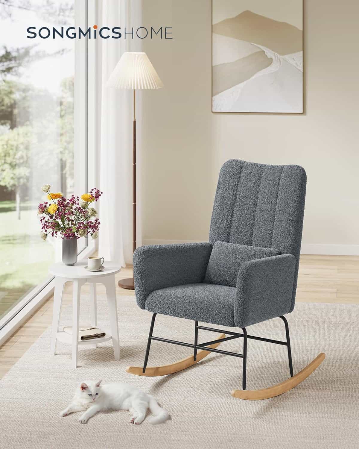 - Protectii la picioare impotriva zgarieturilor Scurta descriere Fotoliul balansoar SONGMICS aduce relaxare si confort in orice incapere. Conceput cu un cadru solid din otel si picioare din lemn de cauciuc, sustine pana la 136 kg. Suprafata din fleece moale si bratele confortabile asigura o experienta placuta la citit, odihna sau relaxare. Cu un unghi de balans de 105°, se integreaza perfect in dormitor, living sau birou. Caracteristici principale Fotoliu balansoar modern cu design elegant Suprafata moale din fleece si umplutura groasa Brate confortabile pentru sprijin suplimentar Structura solida: cadru otel + picioare lemn de cauciuc