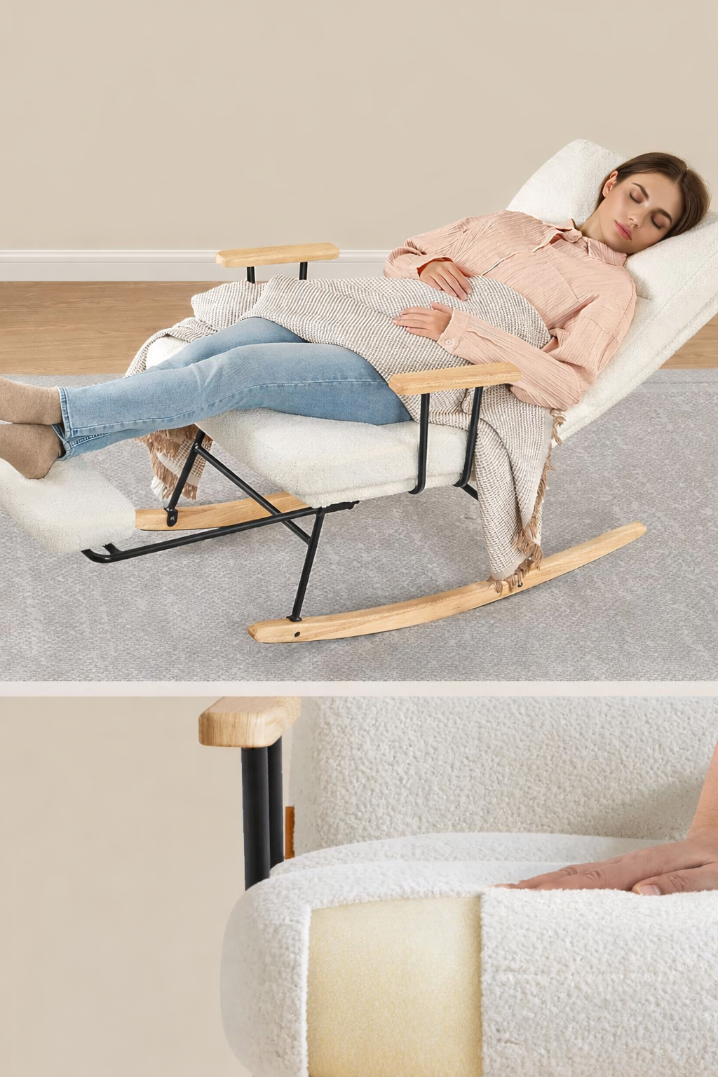 Fotoliu balansoar reglabil cu suport picioare reglabil, textil plusat, 85x75x105 cm, crem Mob360 – produs disponibil în magazinul Mob360.