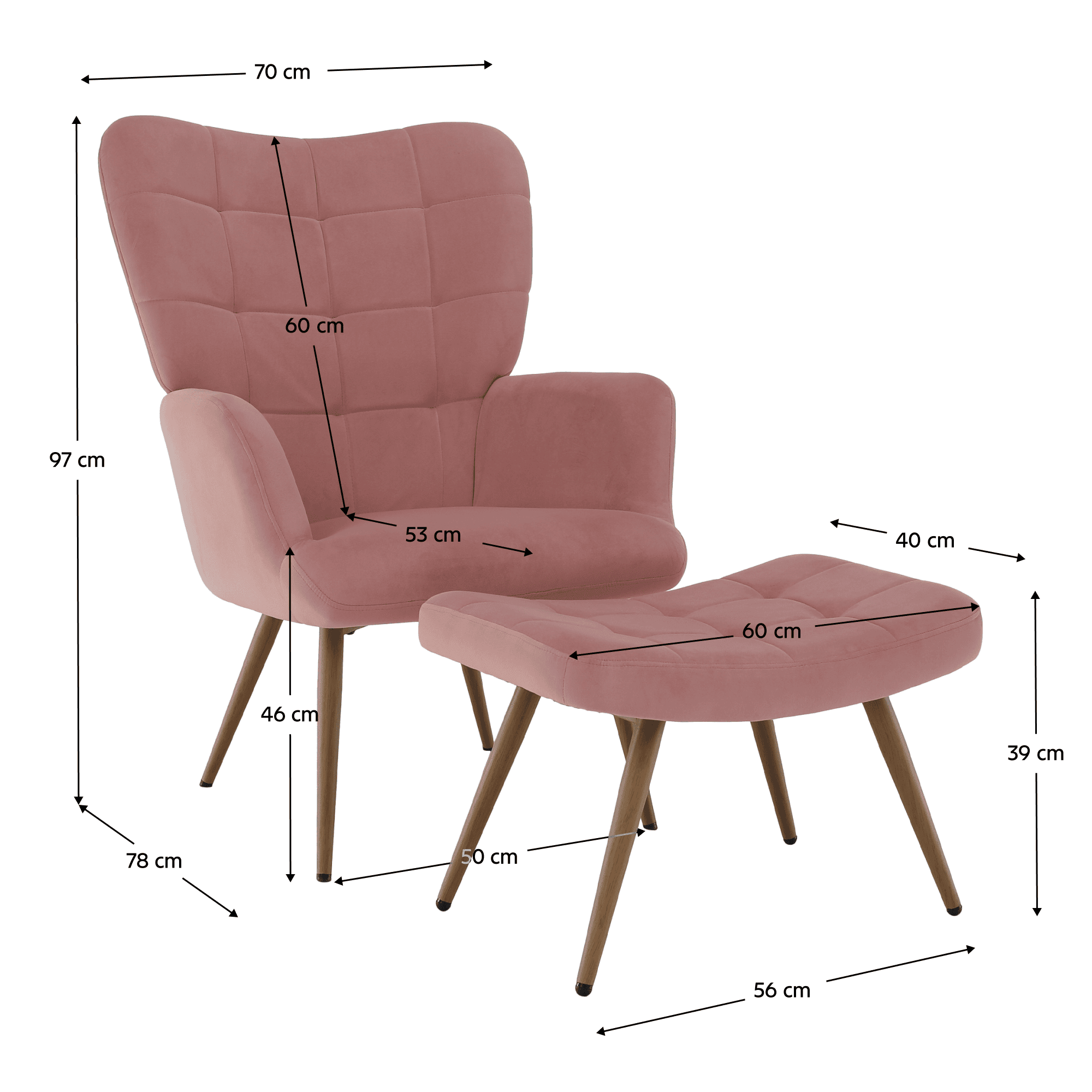 Material: ţesătură Velvet 32/metal Rezistenţa ţesăturii la frecare conform testului Martindale: 95 000 cicluri de frecare Culoare: roz/stejar Dimensiunile scaunului (Lxlxh): 70x78x97 cm Înălţimea părţii de şezut: 46 cm Adâncimea părţii de şezut: 53 cm Dimensiunile bazei (Lxlxh): 56,5x40x39 cm Picioarele de la supportul de picioare sunt reglabile pe înălţime Portanţa fotoliului: 90 kg Portanţa suportului pentru picioare: 80 kg Livrat dezasamblat