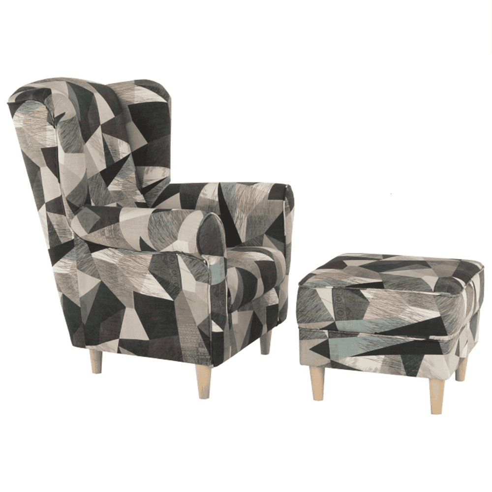 Design: ţesătură Holm model maro-verde- picioare din lemn. Dimensiuni (LxHxD): fotoliu – 86x105x82 cm, taburet – 53x42x53 cm. Livrat nemontat.