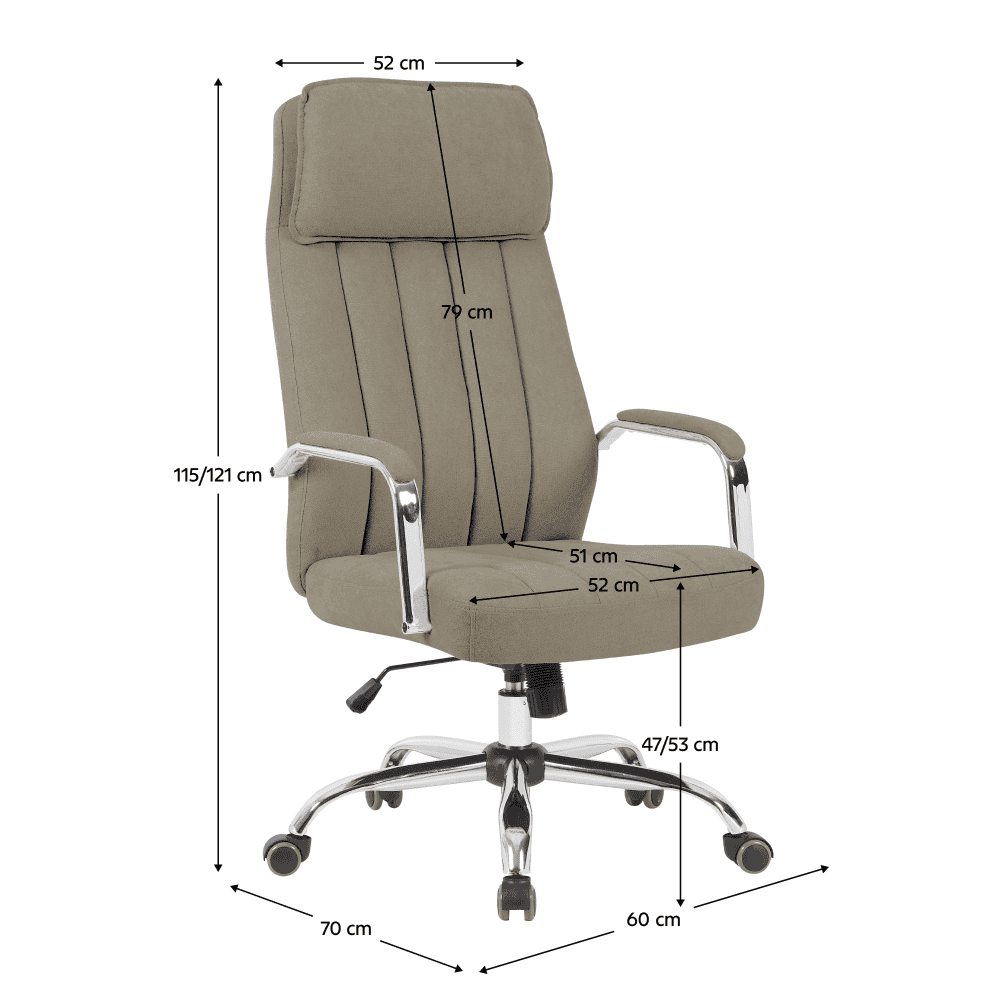 Material: ţesătură/metal Rezistenţa ţesăturii la frecare conform testului Martindale: 80 000 de cicluri de frecare Culoare: bej/crom Dimensiuni (lxAxh): 60x70x115-121 cm Înălţime părţii de şezut: 47-53 cm Adâncimea părţii de şezut: 51 cm Lăţimea părţii de şezut: 52 cm Lăţime spătar: 52 cm Înălţime spătar: 79 cm Portanţă: 130 kg Funcţie de pivotare Funcţie de balansare Înălţime reglabilă a scaunului Cu cotiere căptuşite Partea de şezut modelată Roţi universale Roţile sunt potrivite atât pentru podele moi, cât şi cele dure Practic Livrat dezasamblat