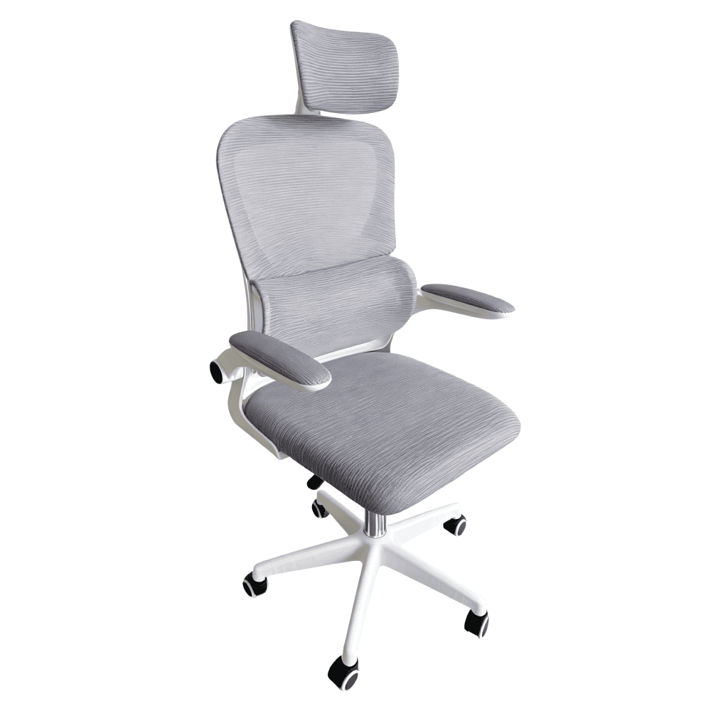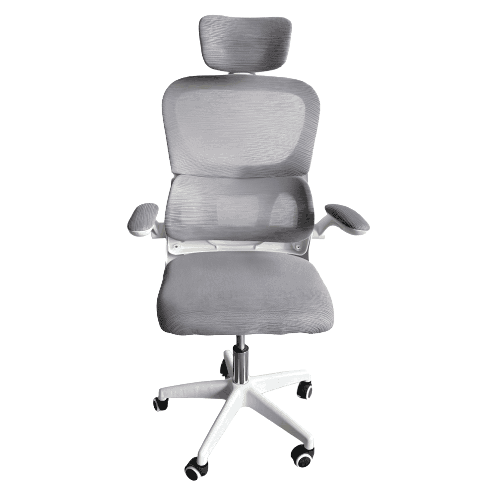 Material: plasă /plastic Rezistenţa ţesăturii la frecare conform testului Martindale: 90 000 de cicluri de frecare Culoare: gri/albă Dimensiuni (lxAxh): 65x62x118-128 cm, Înălţimea părţii de şezut: 37-47 cm Adâncimea părţii de şezut: 47 cm Lăţimea părţii de şezut: 46 cm Lăţime spătar: 50 cm Înălţime spătar: 60 cm Portanţă: 100 kg Rotaţie Funcţie de balansare Înălţime reglabilă a scaunului Înălţime reglabilă a tetierei Cu cotiere Cotiere rabatabile Bază cu cinci stele Roţi universale Potrivit pentru podele moi şi dure Livrat dezasamblat