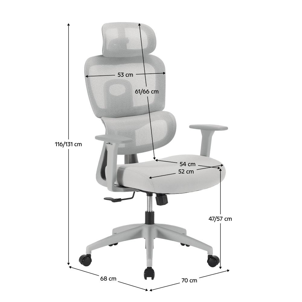 Material: plasă/ţesătură/plastic Rezistenţa plasei conform testului Martindale: 90 000 de cicluri de frecare Rezistenţa ţesăturii conform testului Martindale: 80 000 de cicluri de frecare Culoare: gri deschis/gri Dimensiuni (lxAxh): 70x68x116-121/126-131 cm Înălţimea părţii de şezut: 47-57 cm Adâncimea părţii de şezut: 54 cm Lăţime părţii de şezut: 52 cm Lăţime spătar: 53 cm Înălţime spătar: 61-66 cm Portanţă: 150 kg Scaun rotativ Funcţie de balansare Înălţime reglabilă a părţii de şezut Suport lombar dinamic Înălţime reglabilă a spătarului 3 poziţii de reglare a înălţimii spătarului Unghi reglabil al tetierei Cotiere reglabile pe înălţime şezut confortabil şi moale Roţi universale Roţile sunt potrivite atât pentru podele moi, cât şi dure Practic Caracteristici ergonomice Livrat dezasamblat