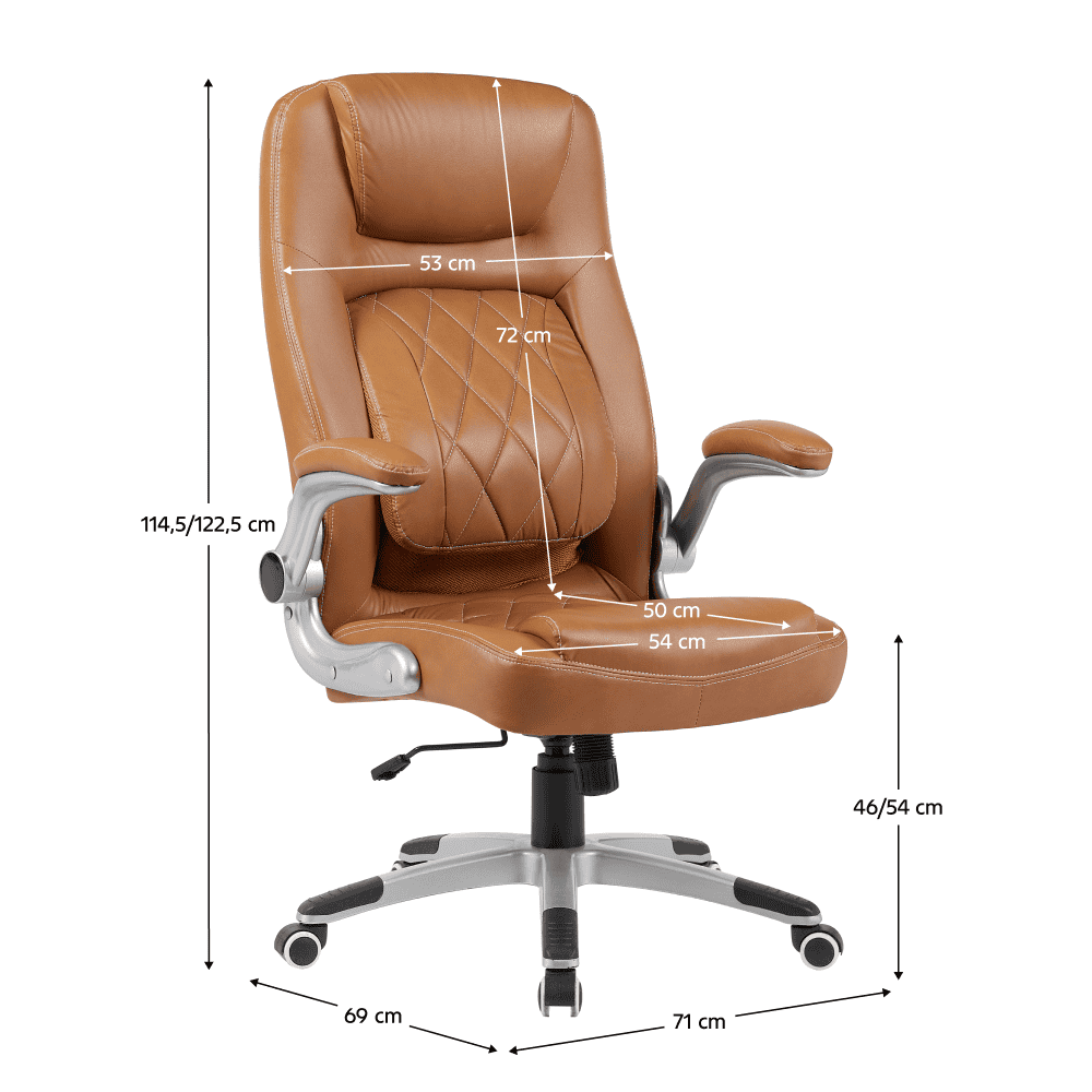 Material: piele ecologică/plastic Rezistenţa la frecare a pielii ecologice conform testului Martindale: 100 000 cicluri de frecare Culoare: maro/argintiu Dimensiuni (lxAxh): 71x69x114,5-122,5 cm Înălţimea părţii de şezut: 46-54 cm Adâncimea părţii de şezut: 50 cm Lăţimea părţii de şezut: 54 cm Înălţime spătar: 72 cm Lăţime spătar: 53 cm Portanţă: 150 kg Scaun pivotant Funcţie de balansare Înălţime reglabilă a părţii de şedere Partea lombară a spătarului este extensibilă Cotiere tapiţate Cotiere pliabile Roţi universale Roţile sunt potrivite atât pentru podele moi, cât şi pentru podele dure Practic Livrat dezasamblat