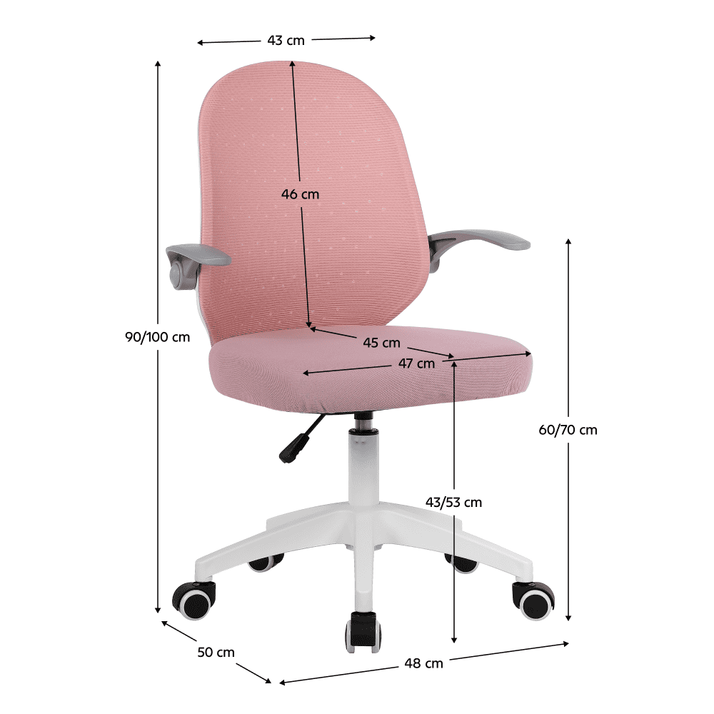 Material: plasă/plastic Rezistenţa ţesăturii la frecare conform testului Martindale: 15 000 de cicluri de frecare Culoare: roz/albă Dimensiuni (lxAxh): 48x50x90-100 cm înălţimea părţii de şezut: 43-53 cm Lăţimea părţii de şezut: 47 cm Adâncimea părţii de şezut: 45 cm Înălţime spătar: 46 cm Lăţime spătar: 43 cm Portanţă: 100 kg Înălţime reglabilă a scaunului Cu cotiere Cotiere pliabile Înălţimea de la sol la cotieră: 60-70 cm Pivotant Roţi universale pivotante Potrivite pentru pardoseli dure şi moi Bază cu cinci braţe Livrat dezasamblat