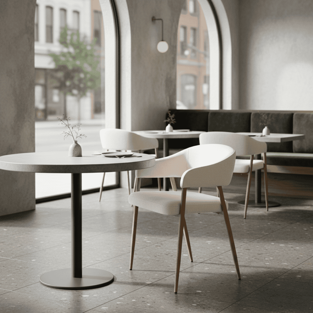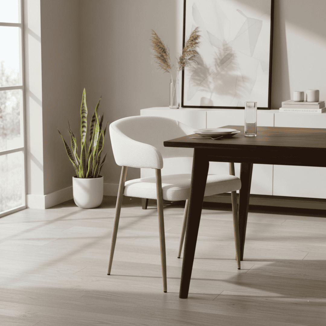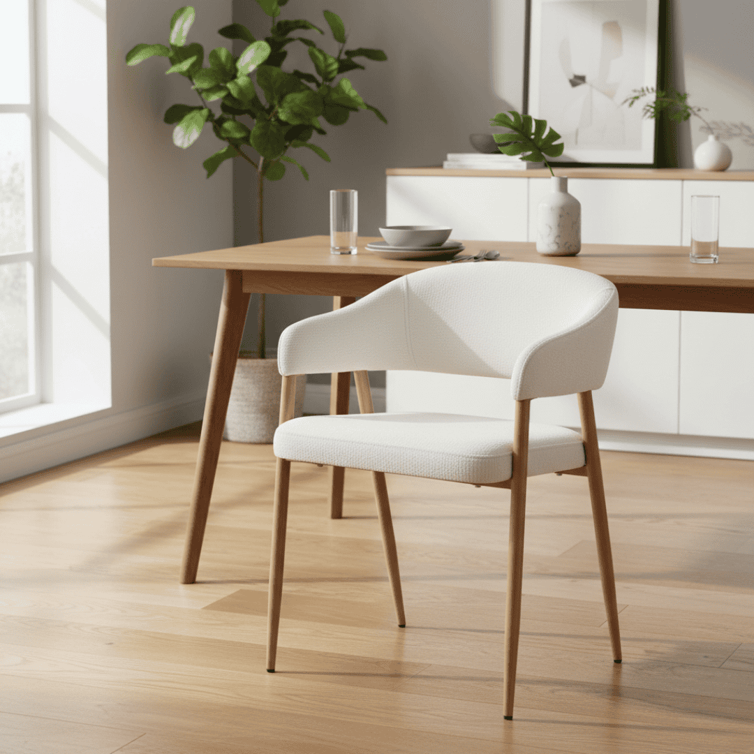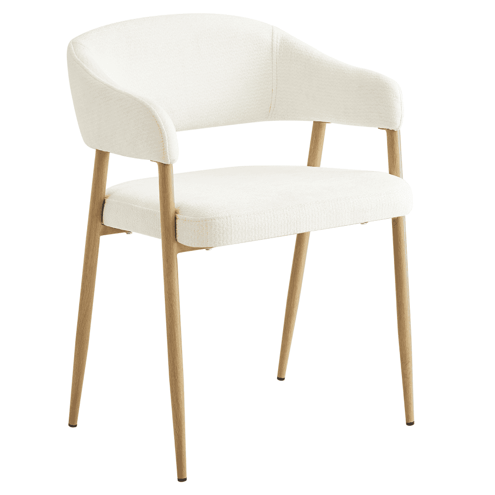 Material: ţesătură/metal Rezistenţa ţesăturii la frecare conform testului Martindale: 80 000 de cicluri de frecare Culoare: crem/fag Dimensiuni (lxAxh): 53,5x51x74 cm Înălţimea părţii de şezut: 48,5 cm Adâncimea părţii de şezut: 45 cm Lăţimea părţii de şezut: 47 cm Lăţime spătar: 53,5 cm Înălţime spătar: 30 cm Portanţă: 100 kg Construcţie metalică De design Livrat dezasamblat