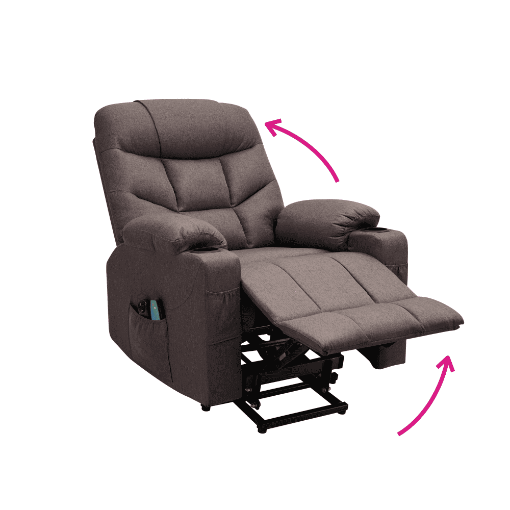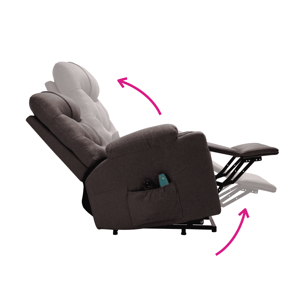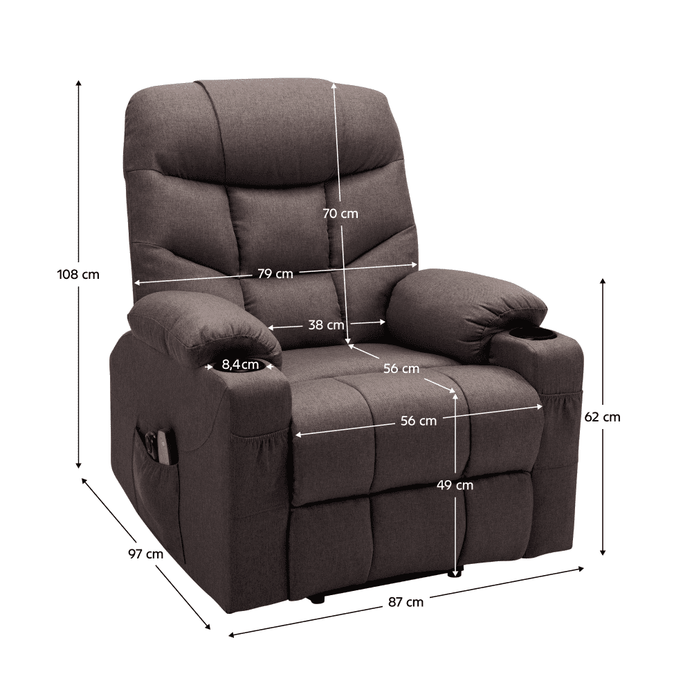 Material:oţel/ţesătură Rezistenţa ţesăturii la frecare conform testului Martindale: 50.000 cicluri de frecare Umplutură: spumă de înaltă densitate 240D Culoare: maro Dimensiuni (Lxlxh): 87×97-155×80-108 cm Înălţimea părţii de şezut: 49 cm Adâncimea părţii de şezut: 56 cm Lăţime părţii de şezut: 56 cm Lăţime spătar: 79 cm Înălţime spătar: 70 cm Portanţă: 150 kg Poziţionabil De masaj De relaxare 6 puncte de vibraţie 8 metode de masaj Temporizator 15-30 min 3 niveluri de intensitate reglabile Spaţiu de depozitare Buzunare laterale practice Funcţie de ridicare electrică Mecanism de extindere a suportului de picioare şi a spatelui Ridicarea scaunului Livrat cu telecomandă pentru poziţionare