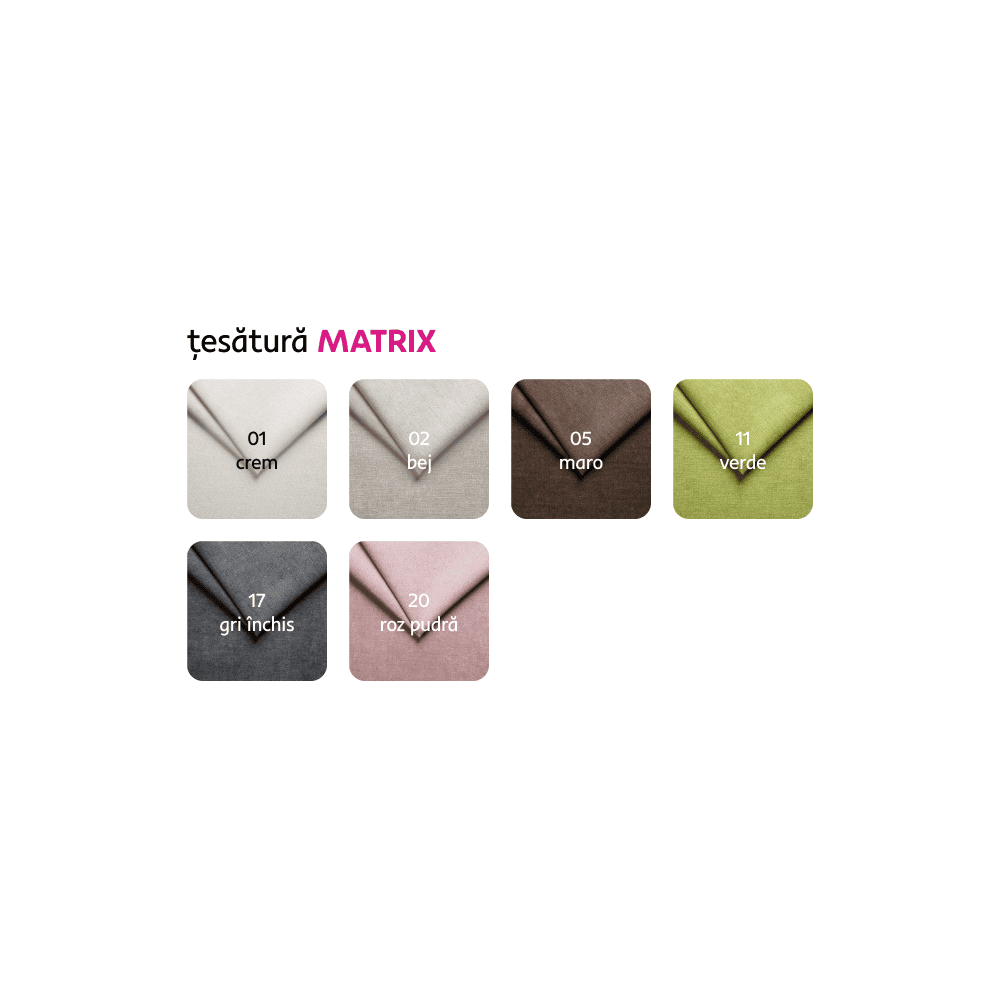 Vă oferim posibilitatea de a alege dintre 6 culori ale ţesăturii Matrix la preţul de 1.659 Lei. Pentru comenzi personalizate este necesară plata unui avans de 20% din suma respectivă. După achitarea avansului, comanda dumneavoastră va intra în producţie. Termenul de livrare de 6-8 săptămâni.