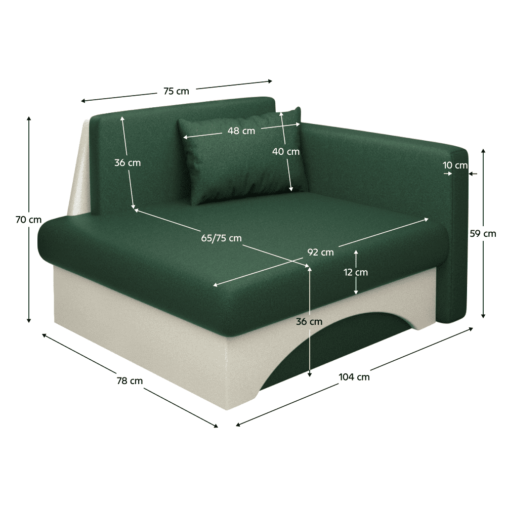 Material: ţesătură Malmo 37/05 Rezistenţa ţesăturii la frecare conform testului Martindale: 30 000 de cicluri de frecare Culoare: maro/bej Dimensiuni (lxAxh): 104x78x70 cm Suprafaţa pentru dormit: 75×185 cm Înălţimea părţii de şezut: 36 cm Adâncimea părţii de şezut: 65/75 cm Lăţimea părţii de şezut: 92 cm Înălţimea cotierei de la sol: 59 cm Dimensiunile spătarului (lxh): 75×36 cm Portanţă pe persoană: 90 kg Livrat cu pernă Dimensiuni pernă (lxh): 48x40cm Extensibilă Compartiment de depozitare Design universal Umplutură: spumă pur T28 Livrat asamblat