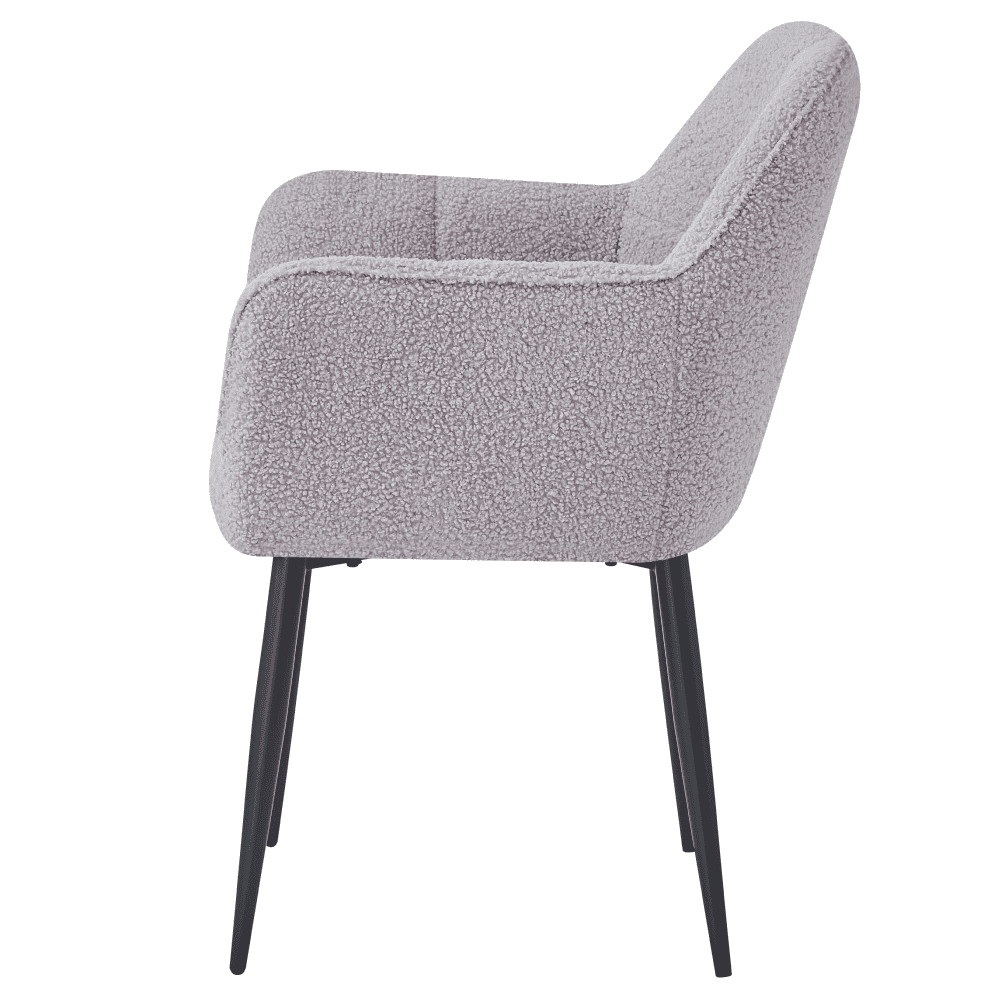 Material: ţesătură Bouclé/metal Rezistenţa ţesăturii la frecare conform testului Martindale: 45 000 de cicluri de frecare Culoare: gri/neagră Dimensiuni (lxAxh): 57x61x84 cm Înălţimea părţii de şezut: 44 cm Adâncimea părţii de şezut: 45 cm Lăţimea părţii de şezut: 44 cm Lăţime spătar: 44 cm Înălţime spătar: 40 cm Cotiere Cusute decorativ De design Portanţă: 90 kg Livrat dezasamblat