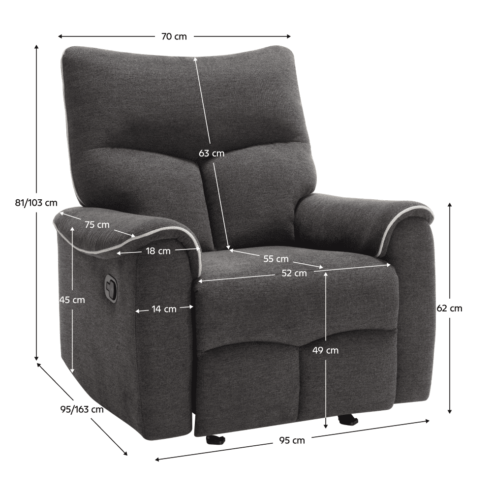 Material: ţesătură/oţel Culoare: gri închis/gri deschis Dimensiuni (lxAxh): 95×95-163×81-81 cm Înălţimea părţii de şezut: 49 cm Adâncimea părţii de şezut: 55 cm Lăţimea părţii de şezut: 52 cm, Lăţimea spatelui: 70 cm Înălţime spate: 63 cm Dimensiuni cotieră (lxAxh): 18x75x45 cm Portanţă: 110 kg Umplutură: spumă Poziţionabil Poziţionabil mecanic De relaxare Cusut decorativ Margini decorative Livrat dezasamblat