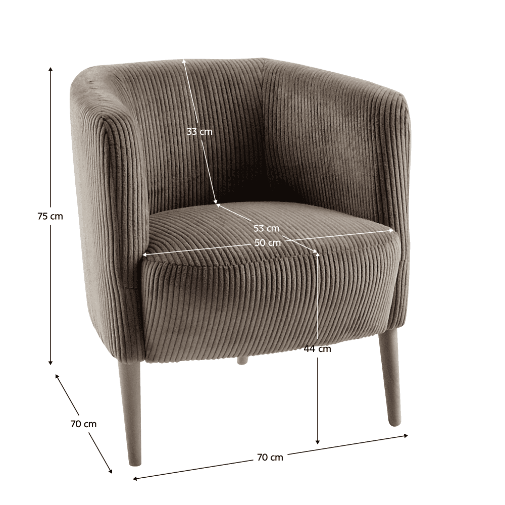 Material: ţesătură Poso 03 / lemn Rezistenţa ţesăturii conform testului Martindale: 90.000 de cicluri Culoare: gri-bej Taupe Dimensiuni (LxAxÎ): 70x70x75 cm Înălţimea scaunului: 44 cm Adâncime scaun: 53 cm Lăţime scaun: 50 cm
