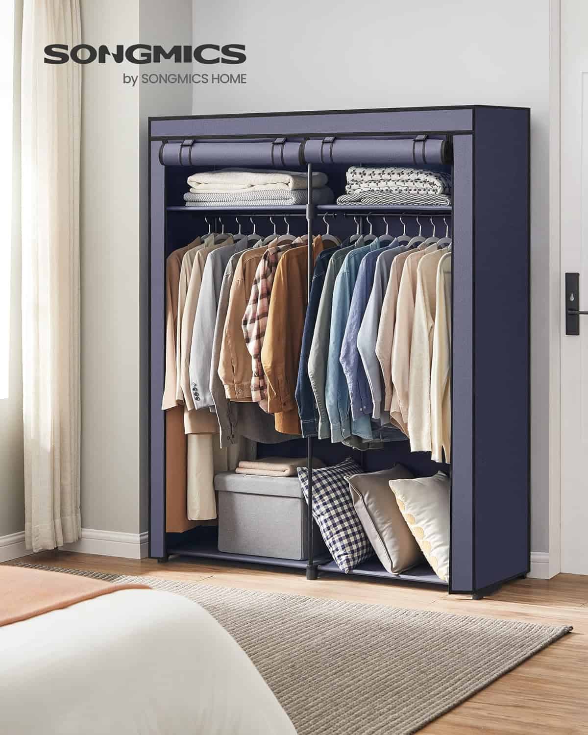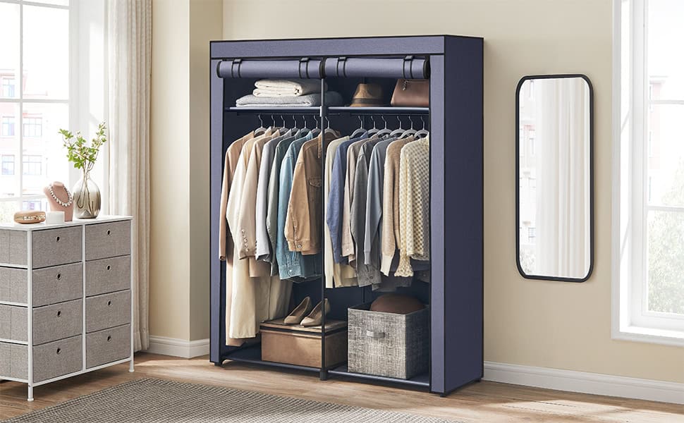Garderoba pentru depozitarea hainelor, din material textil, cu 2 bare pentru umerase, 43x140x174cm, albastru Mob360 – produs disponibil în magazinul Mob360.