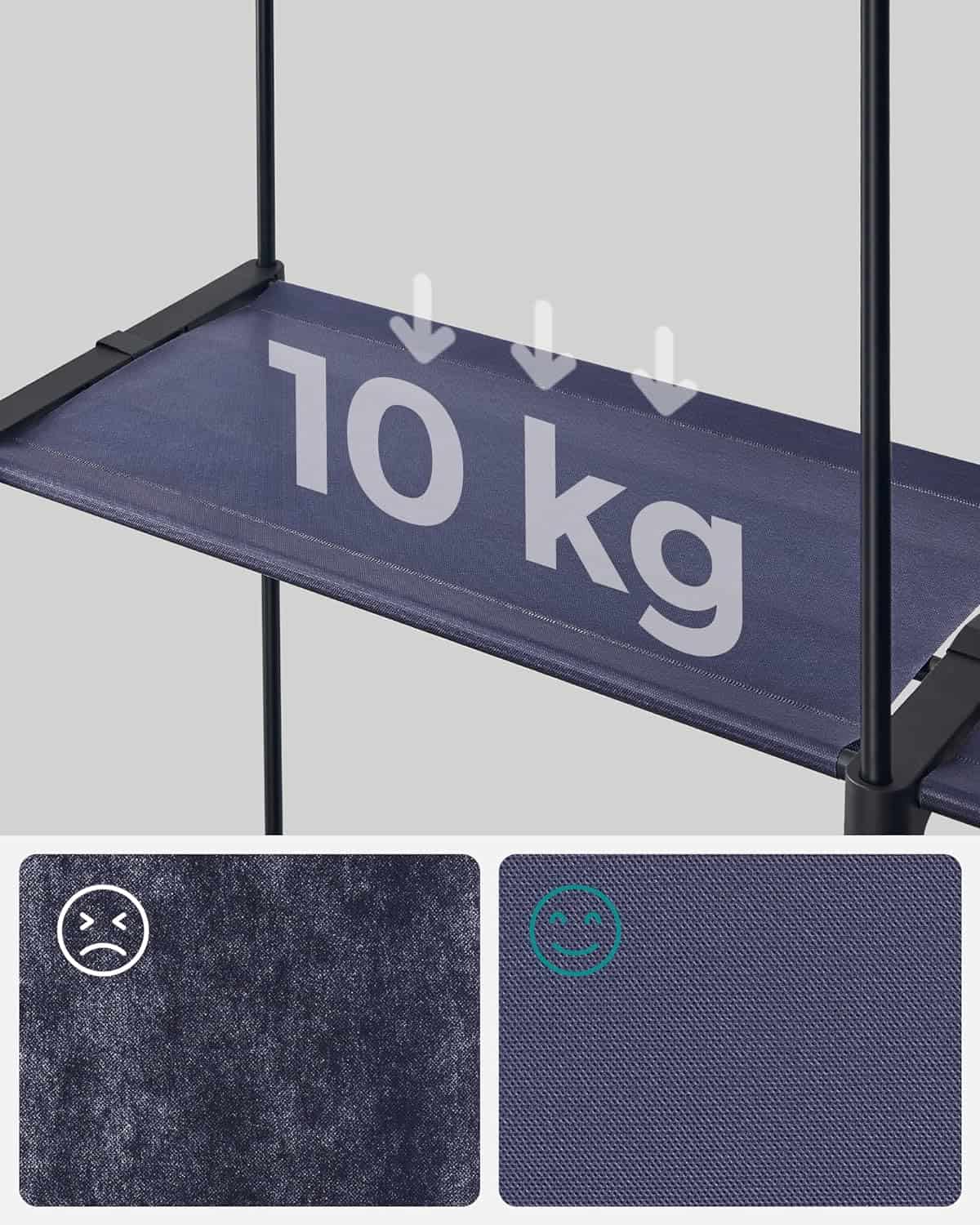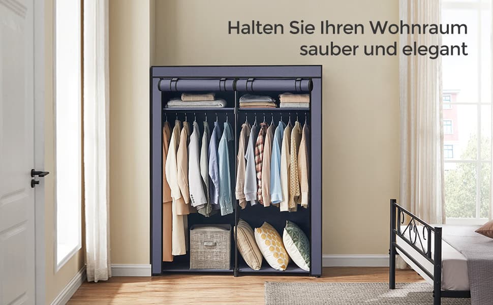 Culoare: Albastru inchis Marca: SONGMICS Dimensiuni articol: L x l x h 140 x 43 x 174 centimetri Despre acest articol Fabricat cu tuburi de otel cu diametrul de 16 mm si imbinari din plastic ranforsat, acest suport de haine ofera un suport solid pentru hainele dvs. (sarcina statica maxima pe tija: 15 kg).Acest dulap are 4 sectiuni de agatat cu o inaltime maxima de 120 cm pentru a va pastra camasile, paltoanele si fustele fara incretituri si rafturi pentru depozitarea pantofilor sau a gentilor.Acest dulap din tesatura este prevazut cu 4 buzunare de depozitare pe o parte pentru a depozita obiecte mici, cum ar fi sosete, chei si manusi. Nu va trebui sa scotociti in cautarea lucrurilor mici atunci cand va grabiti sa iesiti in oras.Tot ce trebuie sa faceti este sa uniti tuburile metalice cu conectori din plastic si sa puneti husa din tesatura.
