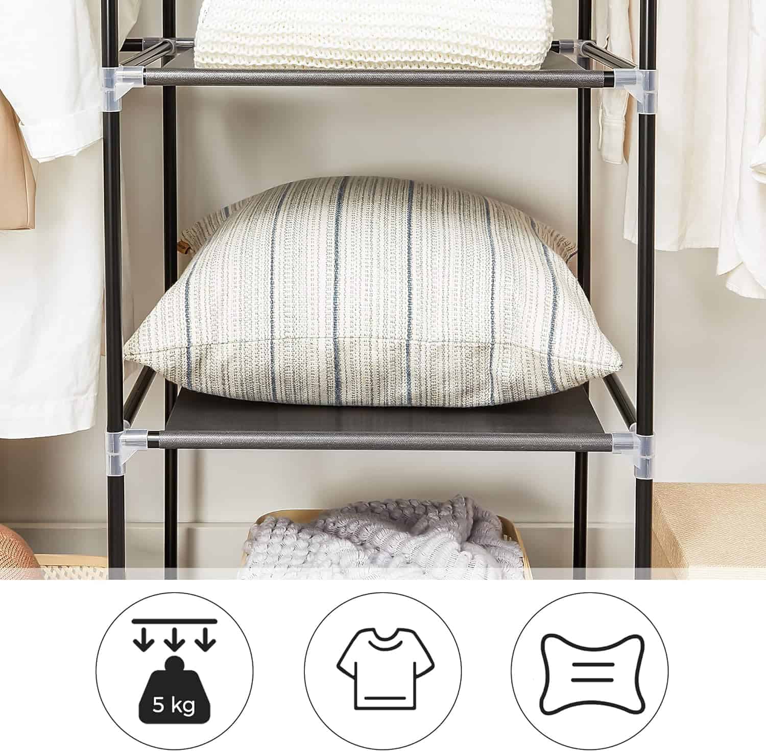 Culoare: Negru Marca: SONGMICS Dimensiune: 150 x 45 x 175 cm Adancimea articolului: 45 centimetri Despre acest articol Datorita tuburilor metalice cu grosimea de 16 mm de pe fiecare raft si a conectorilor din plastic duplex, capacitatea de incarcare poate ajunge la 5 kg pe fiecare raft. Bara de 0,4 mm grosime suporta 15 kg.Acest dulap este echipat cu o husa din material textil cu fermoar si catarame pentru a depozita hainele in mod corespunzator.Nu sunt necesare unelte, trebuie doar sa instalati tuburile si conectorii. Acum puteti pune in functiune acest dulap de haine.
