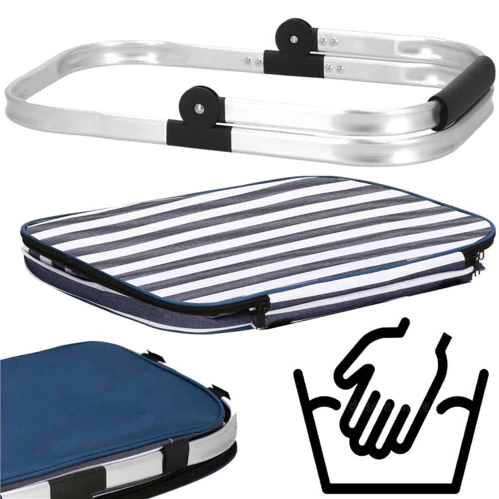 PARAMETRII: Culoare: alb si bleumarinCuloare rama: argintiuCapacitate: 28lLatime: 40 cmAdancime: 25 cmInaltime totala: 46 cmInaltimea cosului: 28Material cadru: metalGrosimea tuburilor de rack: 25×10 mmMaterial de invelis: poliesterMaterial de umplere: spuma PEMaterial captuseala: aluminiuMaterial maner: spumaLatimea manerului pe maner: 15 cmInaltime maner: 23 cmTip de inchidere: fermoar in doua sensuriPliabil: daPosibilitatea dezasamblarii cadrului: daDimensiuni pliate: 43 x 26 x 5 cmSuplimentar: buzunar cu fermoar la exterior, lavabil manualCOS TERMIC MULTIUZCosul termic extrem de incapator este o solutie fantastica atat pentru zilele calde, cat si pentru cele reci. Poate fi folosit pentru excursii in afara orasului, pentru excursii la plaja sau la cumparaturi, ca transportor izolat termic. Mentine temperatura mult timp. Structura metalica ranforsata si finisajul manerului asigura o manipulare sigura a produselor. Este o necesitate absoluta in fiecare casa. AVANTAJE realizate din materiale de inalta calitate – poliester gros, aluminiu, spuma PE izoleaza termic – pastreaza temperatura produselor transportate indiferent de anotimp pastreaza cu succes cald si rece – puteti pune in el produse pe care doriti sa le pastrati calde mult timp, precum si cele care se pot dezgheta in timpul transportului mega capacitate – pana la 28 de litri Strat izolator impermeabil – fara scurgeri, usor de clatit ultra-usoara – echilibrul perfect intre o structura solida si greutate redusa il poti plia – cand nu folosesti cosul, il poti transporta si depozita cu usurinta atunci cand este pliat plat aspect clasic – culori universale si discrete buzunar cu fermoar la exterior cadru detasabil se inchide cu fermoar in doua sensuri – uita de deschiderea si inchiderea complicate fund puternic rigid – cosul nu se va deforma sub greutatea continutului, iar produsele asezate in el vor ramane pe loc Manere pliabile – pliati-le inapoi cand nu folositi manerele Maner din spuma la indemana – puteti transporta confortabil un cos plin, fara teama de a va aluneca mainile In zilele toride de vara, cand mergi la plaja, de exemplu, pune-ti placutele de racire inghetate in geanta si pastreaza efectul de racire mai mult timp, bucurandu-te de bauturile reci si fructele care sunt o salvare in vara fierbinte.
