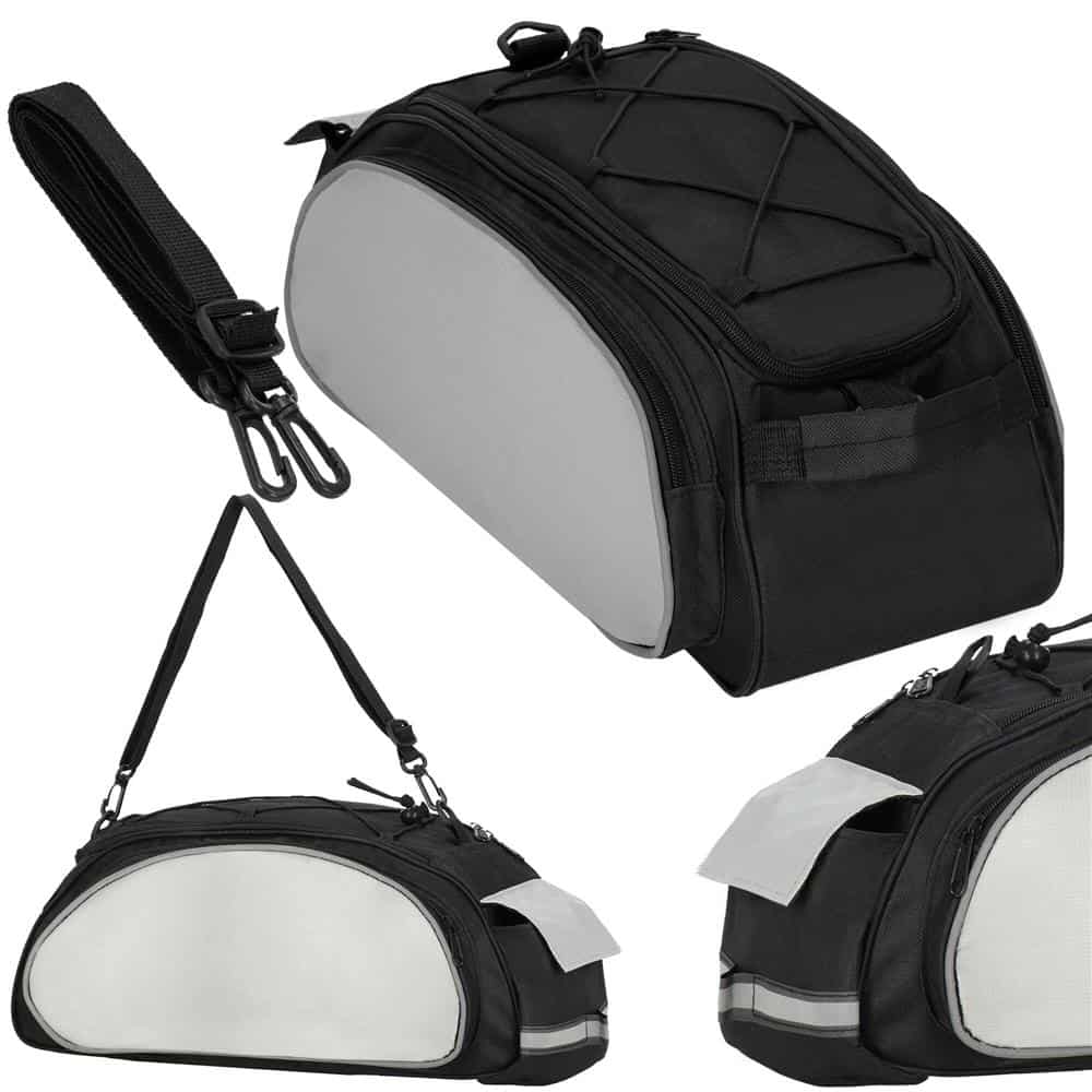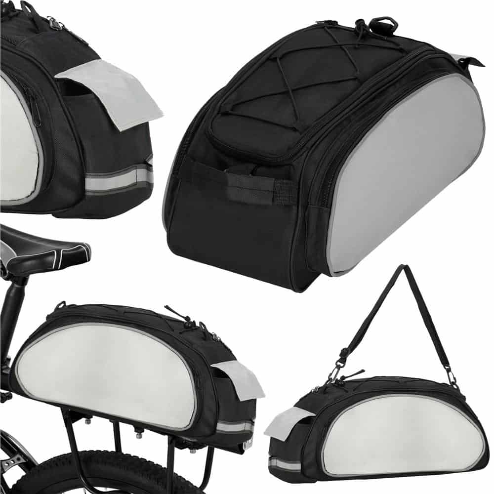 Geanta portbagaj bicicleta, 1 compartiment si 3 buzunare laterale, 40x20x17cm, negru cu elemente reflectorizante gri Mob360 – produs disponibil în magazinul Mob360.