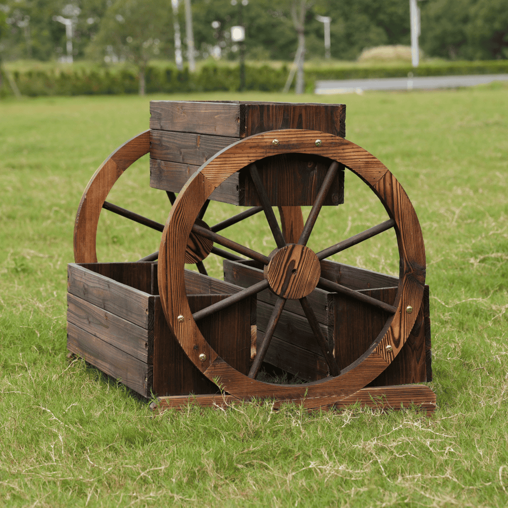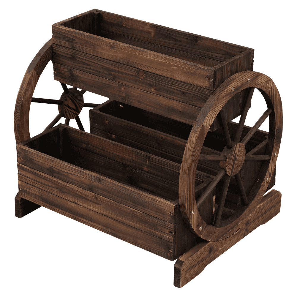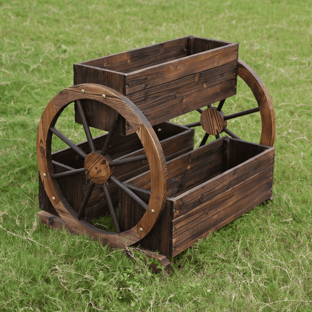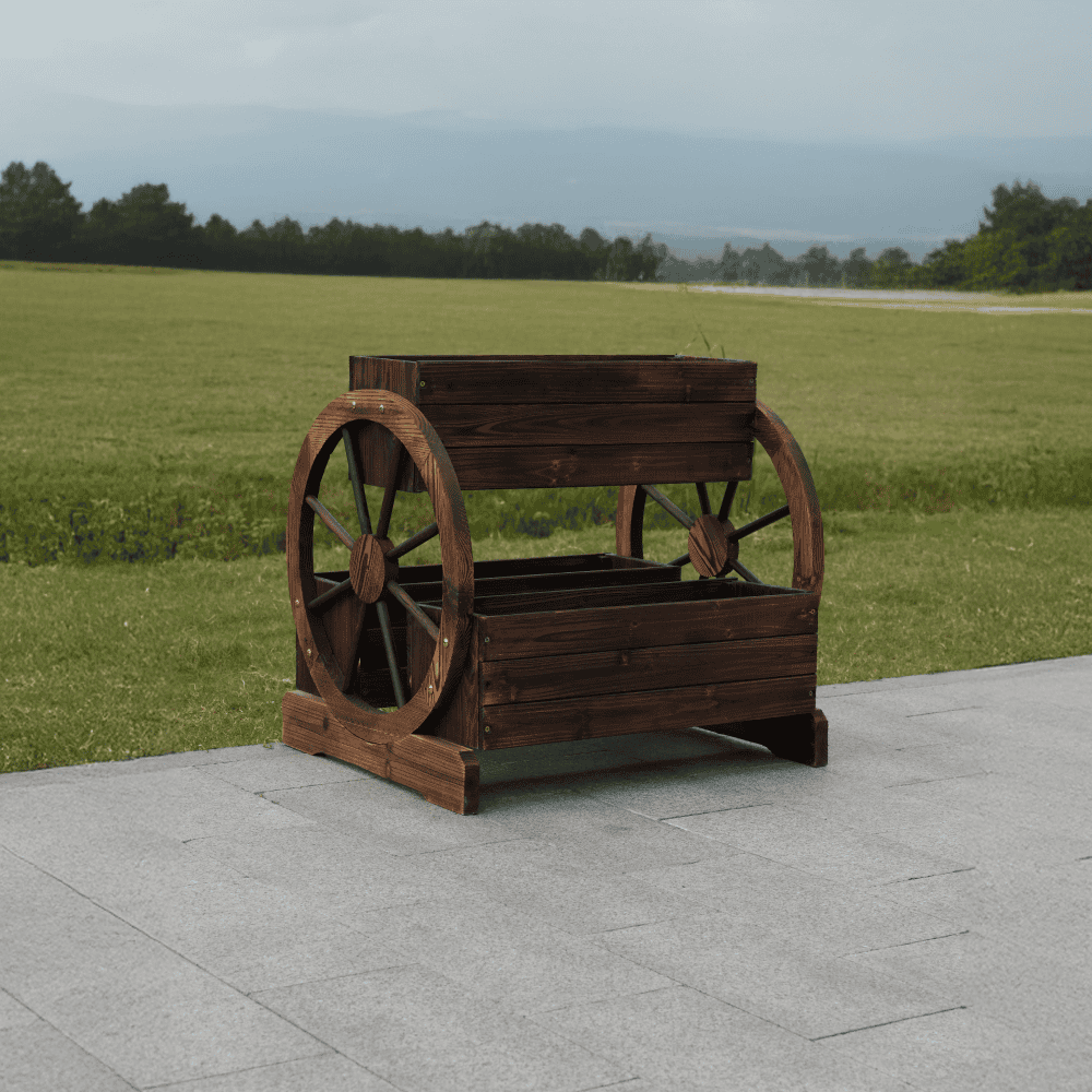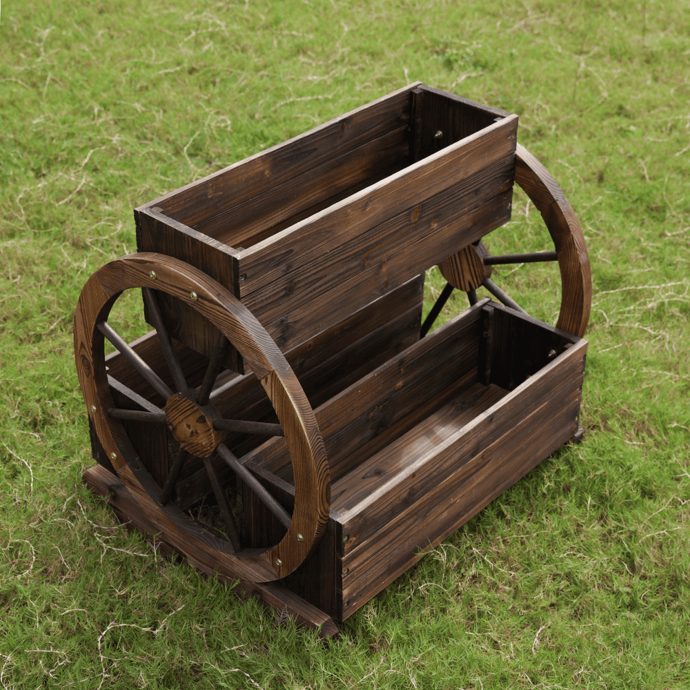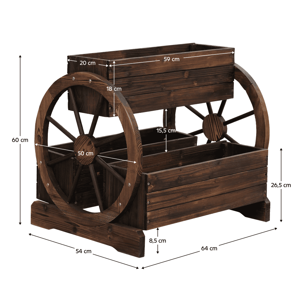 Material: lemn de fag Culoare: maro Dimensiuni (lxAxh): 64x54x60 cm Dimensiuni ghiveci (lxAxh): 59x20x18 cm Înălţime între ghivece de flori: 15,5 cm Diametru roată: 50 cm Pentru grădină sau terasă Orificiu de scurgere pentru excesul de apă Stil rustic Rezistentă la intemperii Vă recomandăm să protejaţi produsul de intemperii pentru a prelungi durata de viaţă a produsului Livrată dezasamblată