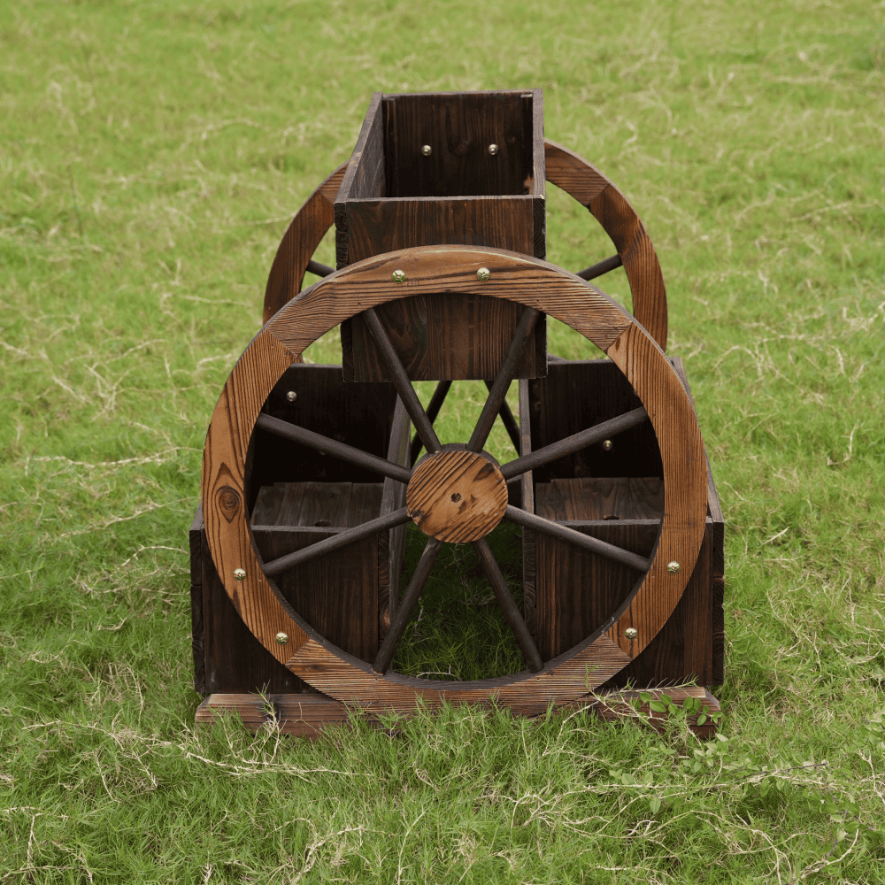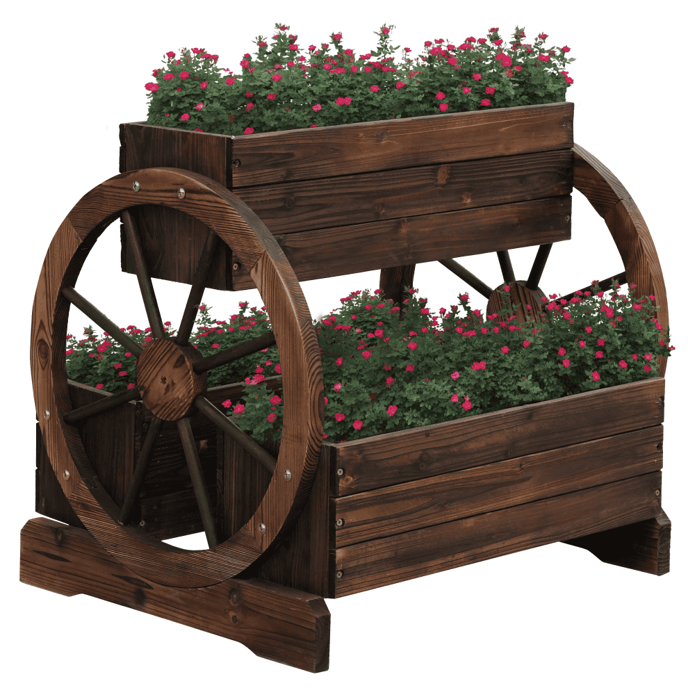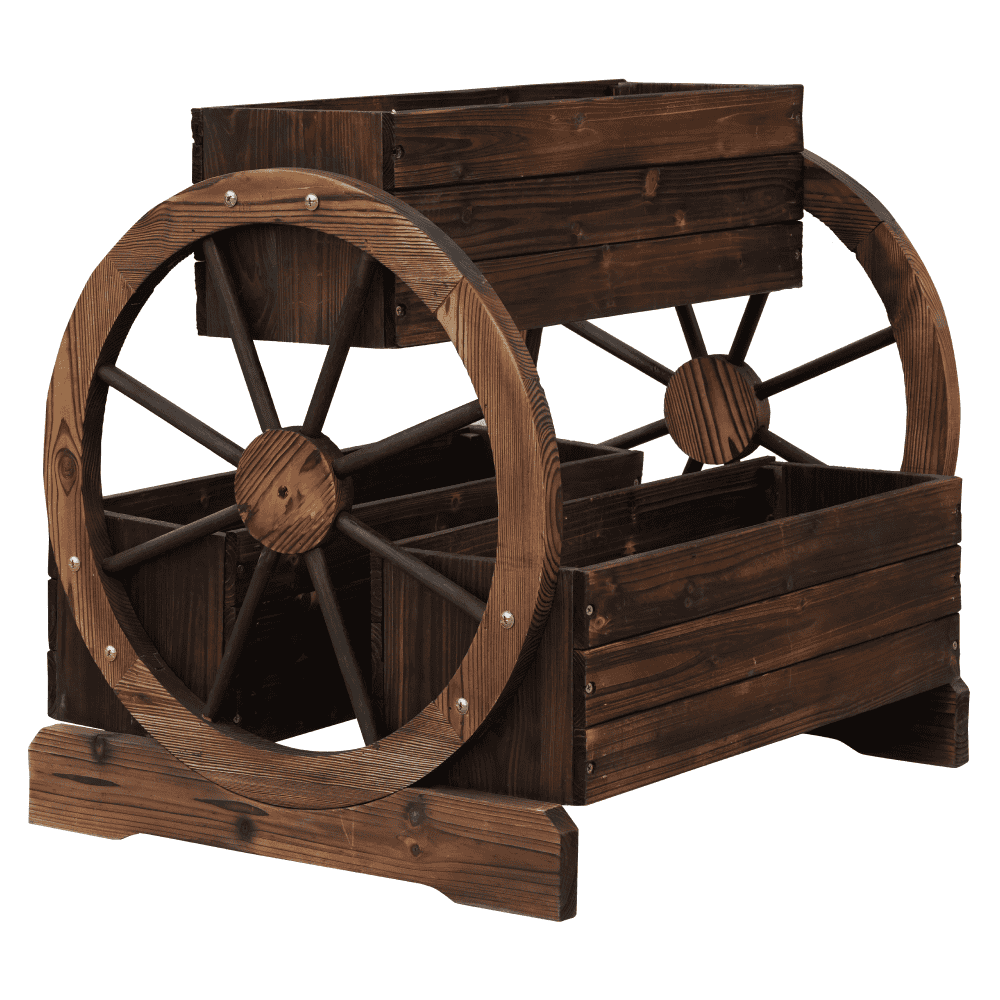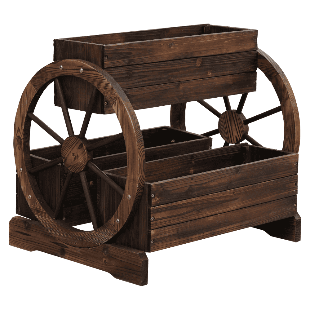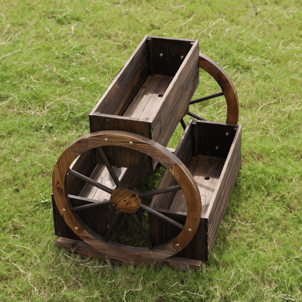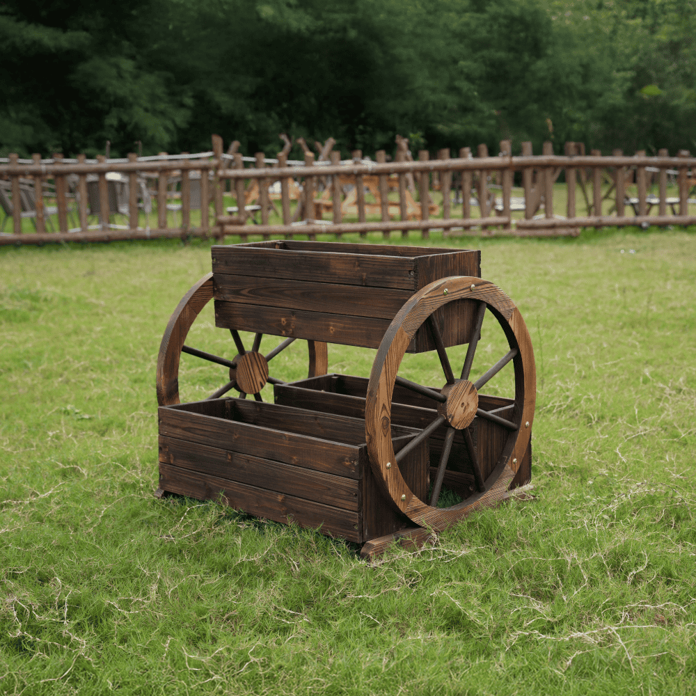 Material: lemn de fag Culoare: maro Dimensiuni (lxAxh): 64x54x60 cm Dimensiuni ghiveci (lxAxh): 59x20x18 cm Înălţime între ghivece de flori: 15,5 cm Diametru roată: 50 cm Pentru grădină sau terasă Orificiu de scurgere pentru excesul de apă Stil rustic Rezistentă la intemperii Vă recomandăm să protejaţi produsul de intemperii pentru a prelungi durata de viaţă a produsului Livrată dezasamblată