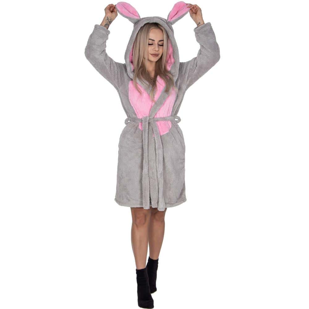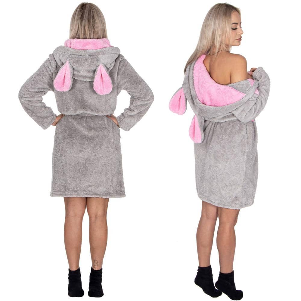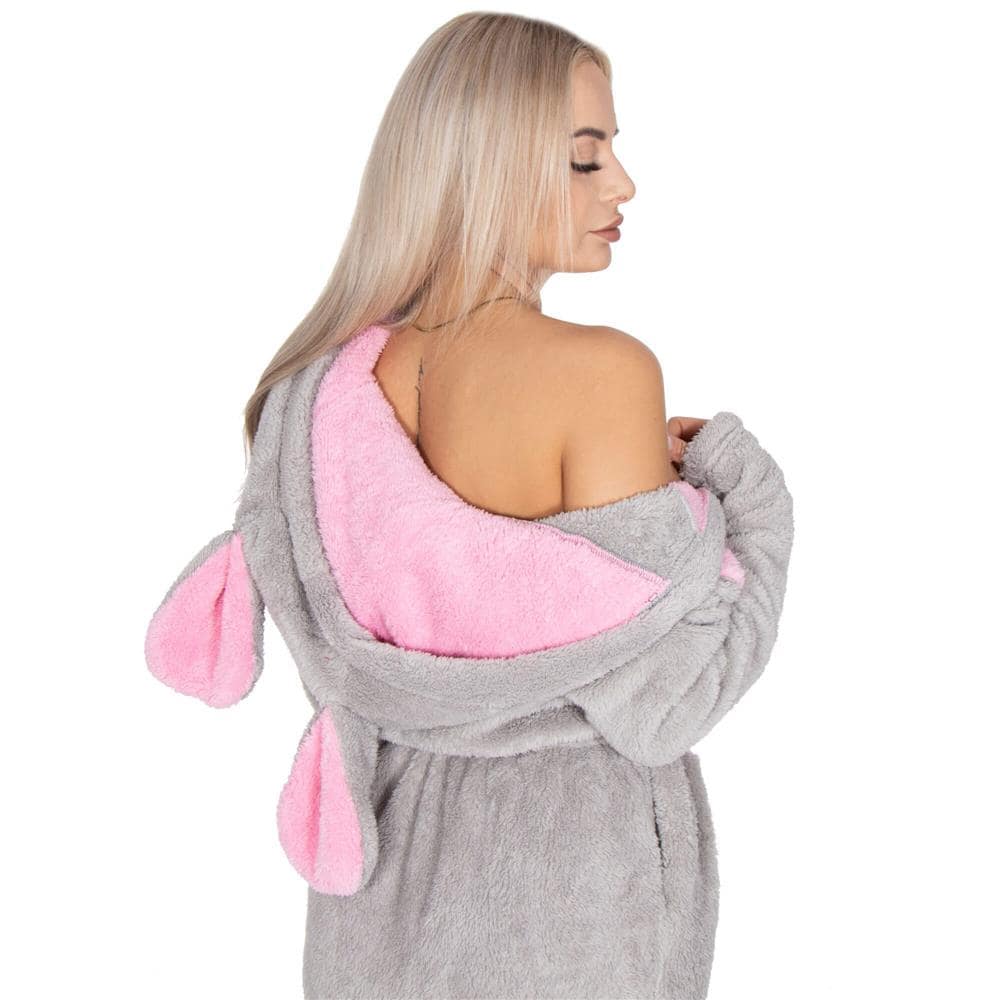 Halat de baie pentru femei pana la genunchi, gluga cu urechi , marimea L/M, gri si nuante de roz Mob360