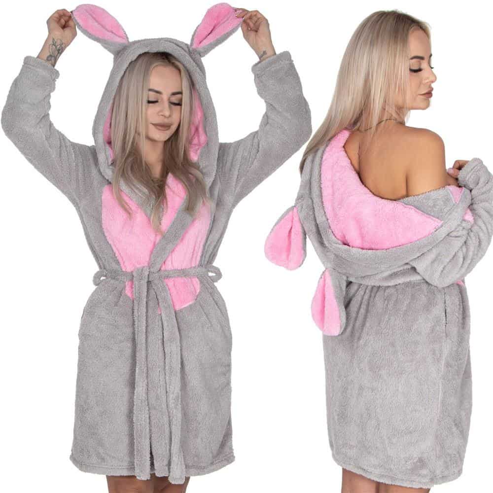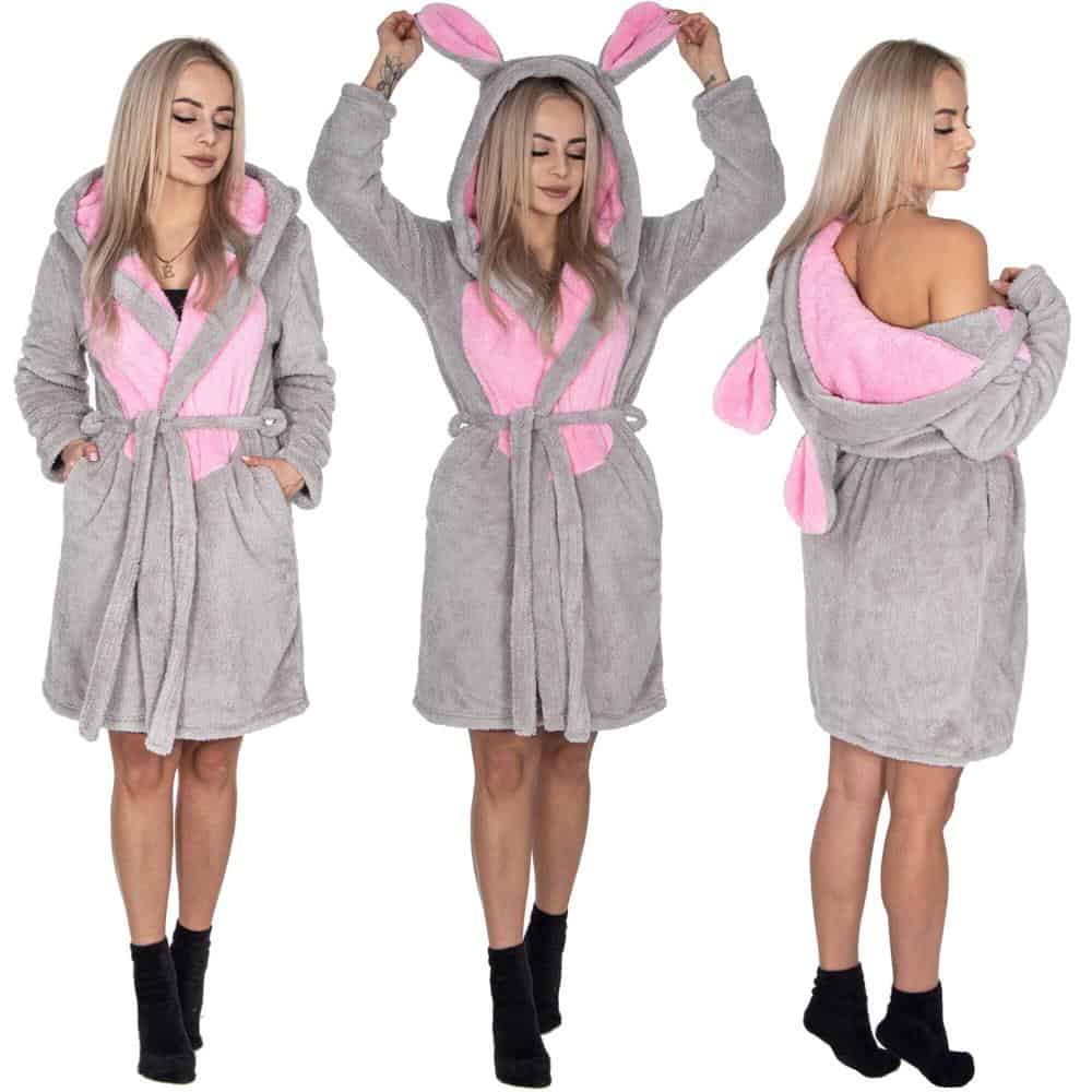 Halat de baie pentru femei pana la genunchi, gluga cu urechi , marimea L/M, gri si nuante de roz Mob360 – produs disponibil în magazinul Mob360.