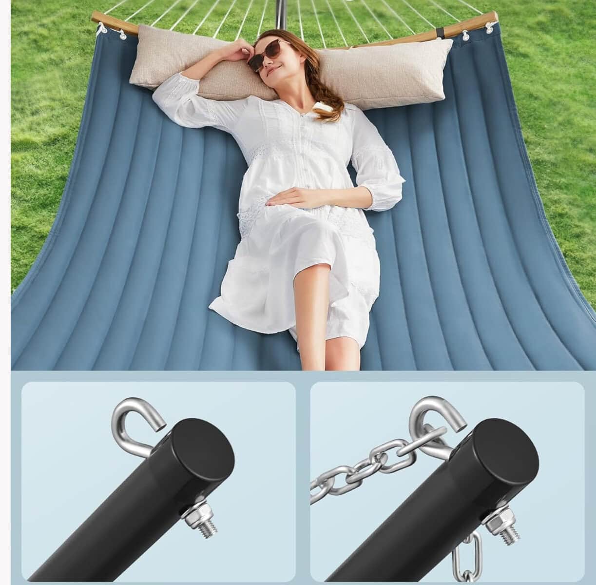 Hamac cu suport metalic, cu suprafata captusita, reglabil, include perna, 200 kg, 300x120x110 cm, albastru Mob360