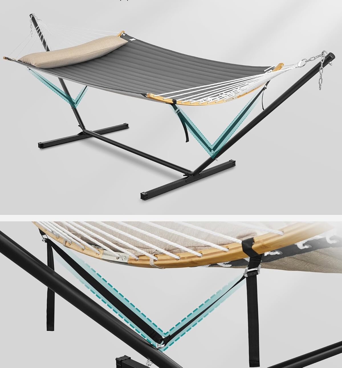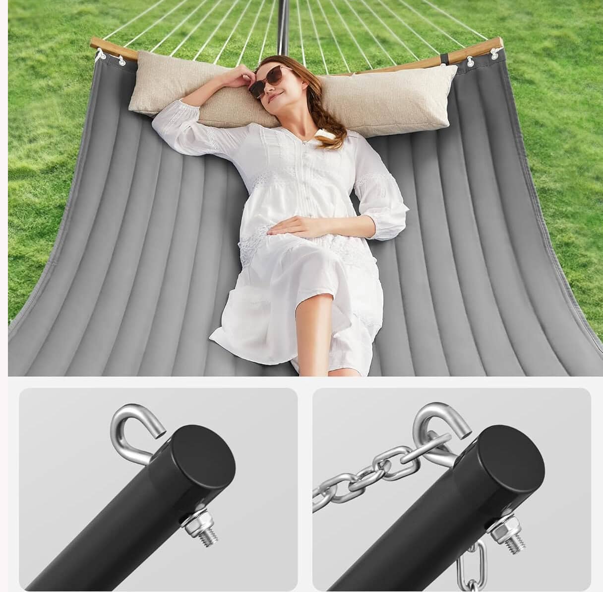 Hamac cu suport metalic, cu suprafata captusita, reglabil, include perna, 200 kg, 300x120x110 cm, gri Mob360