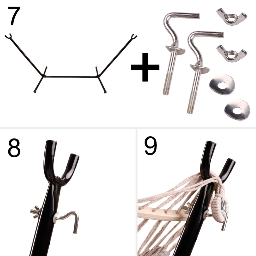 - Ideal pentru relaxare in aer liber, hamacul cu suport metalic este solutia perfecta pentru curte, terasa sau camping. Cu structura robusta si material confortabil, ofera stabilitate si usurinta in montare, fiind perfect pentru utilizare individuala. Datorita inaltimii reglabile si dracusului din lemn, hamacul este confortabil si sigur pentru toate varstele. Caracteristici principale: