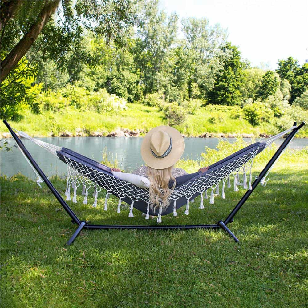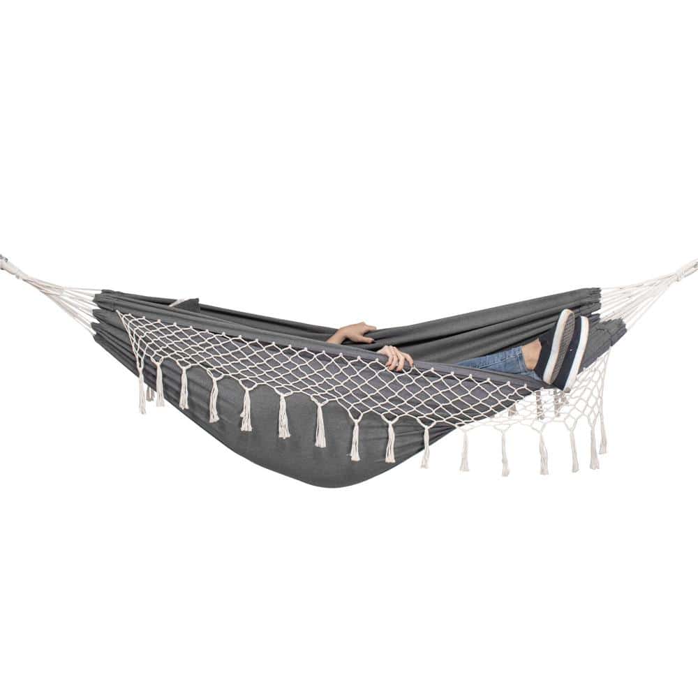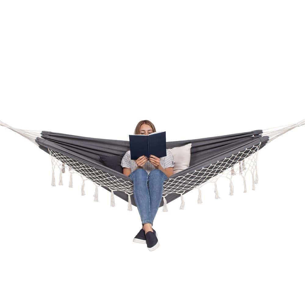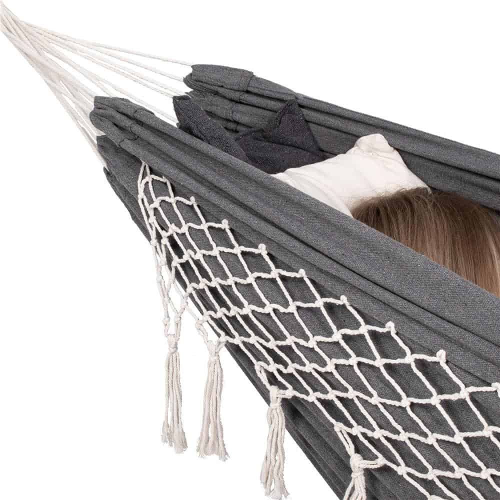 Hamac doua persoane cu franjuri si 2 perne, 200kg, 200×150 cm, gri inchis Mob360
