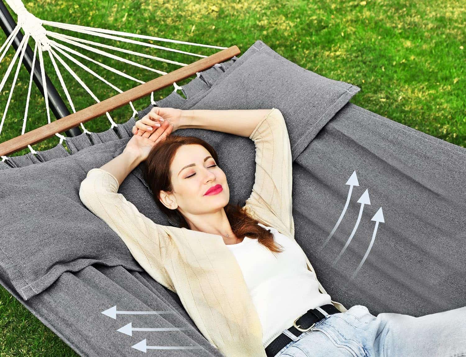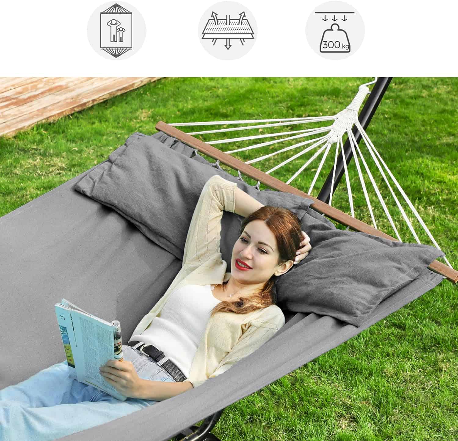Hamac dublu cu bara stabilizatoare din lemn, 2 perne, 210x150cm, maxim 300kg, gri Mob360