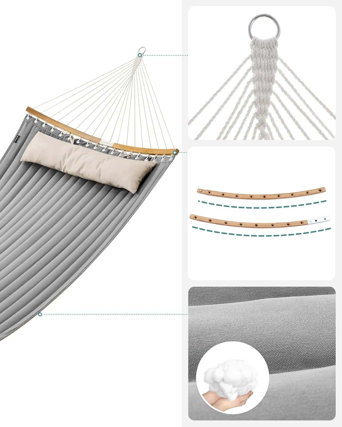 Hamac dublu cu bare curbate din bambus, perna inclusa, maxim 225 kg, 200×140 cm, gri Mob360