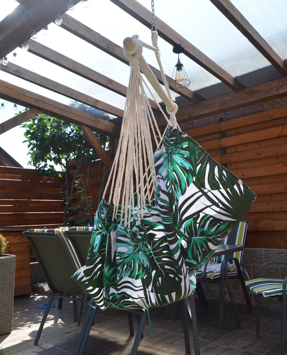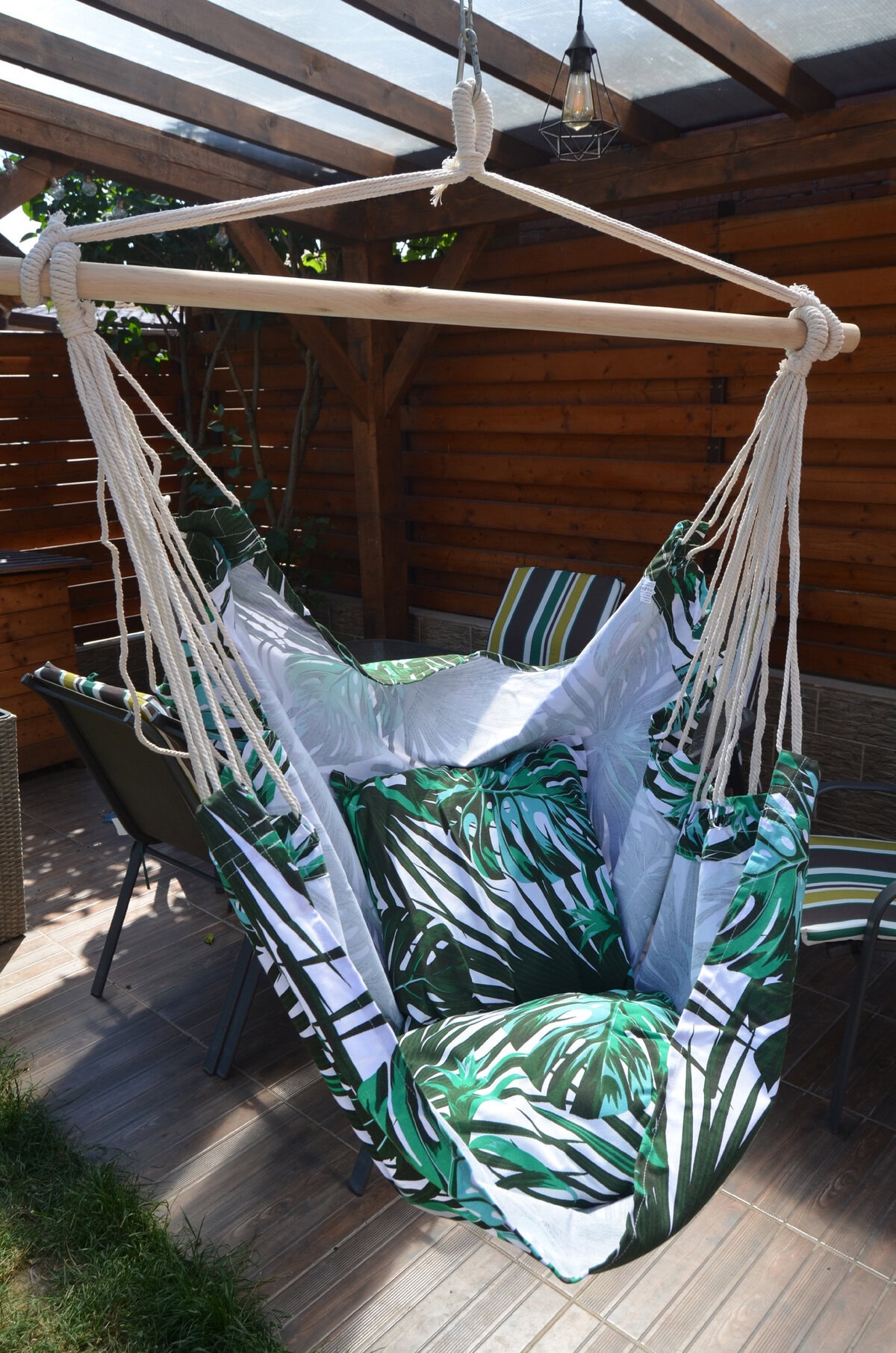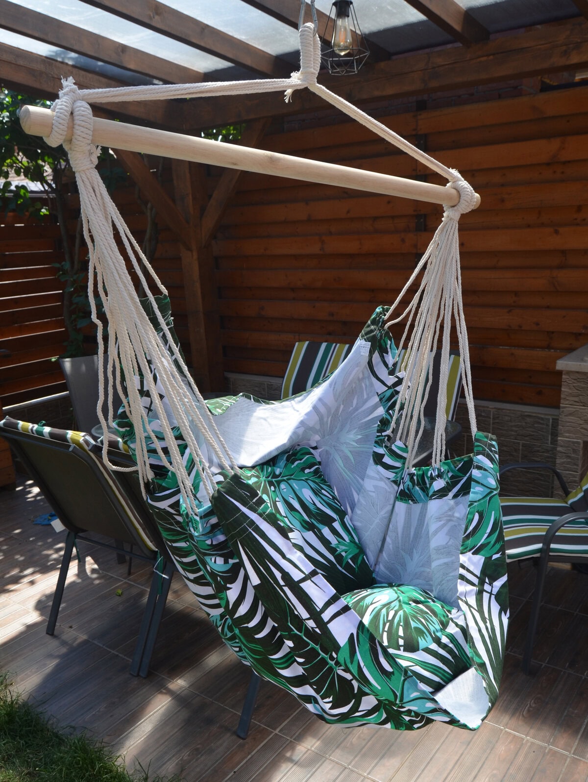 - Scaun tip leagan suspendat pentru casa sau gradina, floral, 130x100cm, 150kg, bumbac + poliester Petreceti zilele calduroase de vara la umbra intr-un hamac tip scaun. Trebuie doar agatat in gradina, terasa sau ramurile unui copac si te poti bucura de odihna si aer curat.Materialul special captusit asigura confort si suport suplimentar, iar bara de sustinere din lemn care sustine franghiile este prevazuta cu un inel care faciliteaza suspendarea acestuia. Dupa plierea scaunului acesta ocupa putin spatiu putand fi luat cu usurinta oriunde.Hamacul poate fi folosit atat de copii cat si de adulti. Caracteristici: – hamac tip scaun; – recomandat pentru o persoana; – material rezistent si funii puternice; – bara din lemn pentru sustinerea franghiilor; – confectionat din bumbac si fibre sintetice; – prevazut cu inel pentru suspendare; – usor de asamblat; – poate fi montat in gradina, terasa sau ramurile unui copac; – poate fi utilizat atat de copii cat si de adulti; – greutate maxima suportata 150 kg; – latime bara de lemn 100 cm; – latime material sezut 100 cm; – inaltime totala hamac 130 cm; – greutate hamac 2.5 kg; – culoare model floral. – include 2 perne