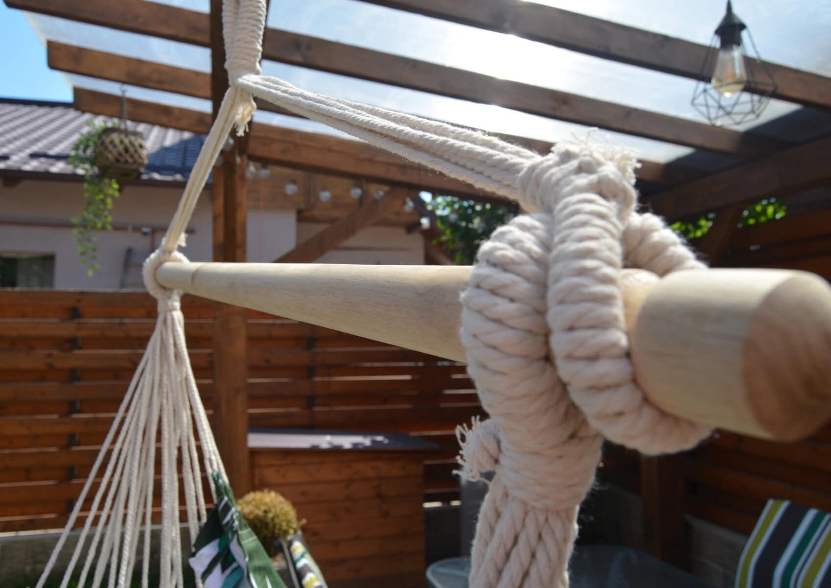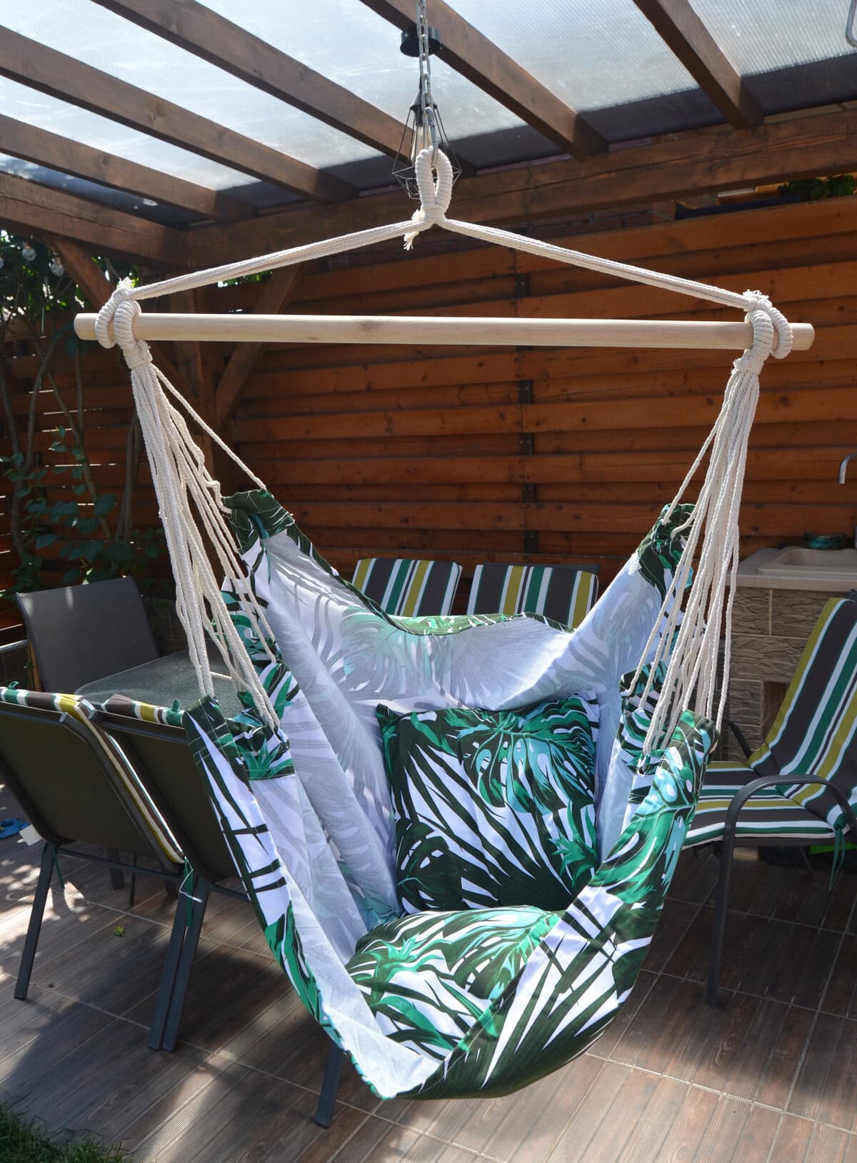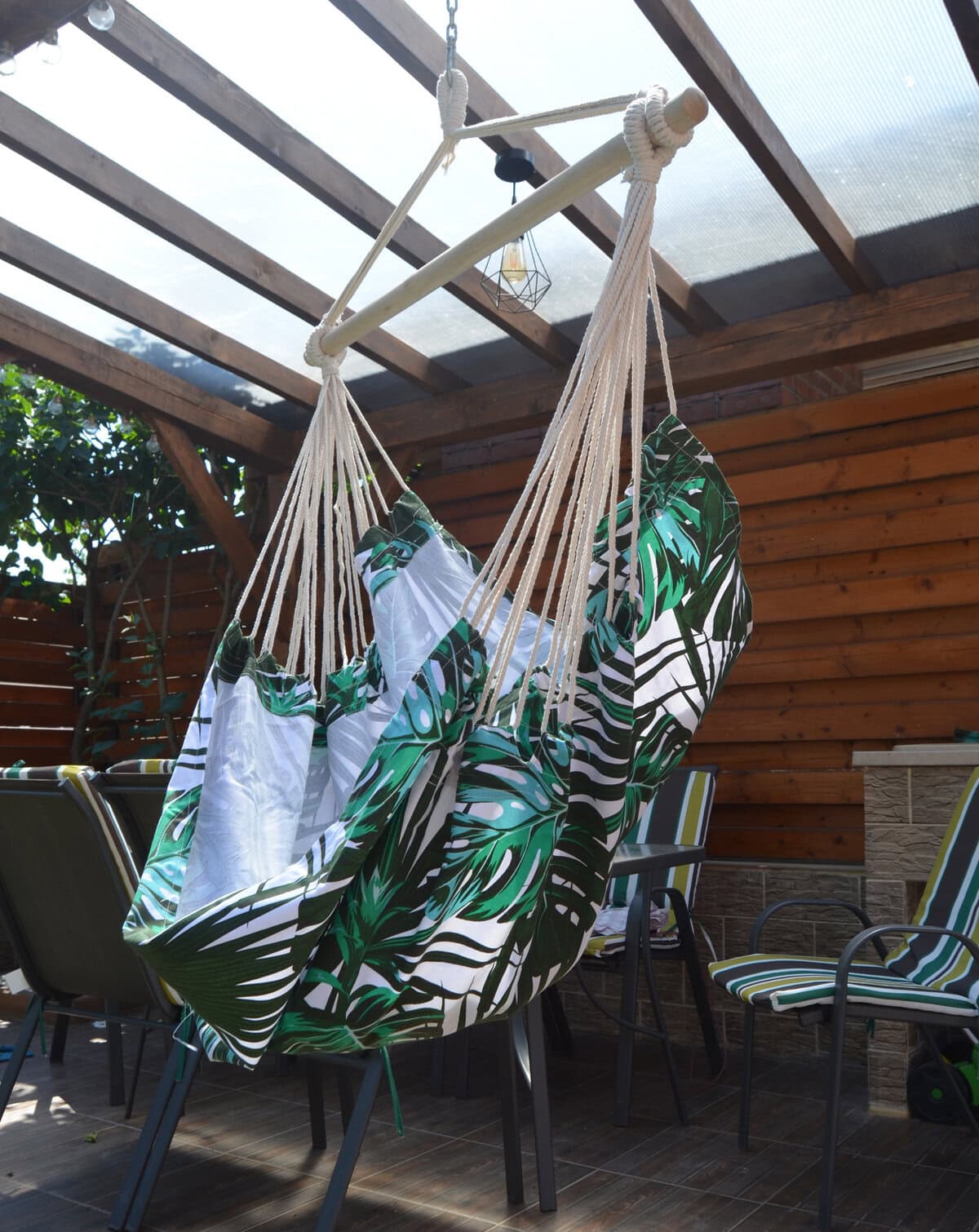- Scaun tip leagan suspendat pentru casa sau gradina, floral, 130x100cm, 150kg, bumbac + poliester Petreceti zilele calduroase de vara la umbra intr-un hamac tip scaun. Trebuie doar agatat in gradina, terasa sau ramurile unui copac si te poti bucura de odihna si aer curat.Materialul special captusit asigura confort si suport suplimentar, iar bara de sustinere din lemn care sustine franghiile este prevazuta cu un inel care faciliteaza suspendarea acestuia. Dupa plierea scaunului acesta ocupa putin spatiu putand fi luat cu usurinta oriunde.Hamacul poate fi folosit atat de copii cat si de adulti. Caracteristici: – hamac tip scaun; – recomandat pentru o persoana; – material rezistent si funii puternice; – bara din lemn pentru sustinerea franghiilor; – confectionat din bumbac si fibre sintetice; – prevazut cu inel pentru suspendare; – usor de asamblat; – poate fi montat in gradina, terasa sau ramurile unui copac; – poate fi utilizat atat de copii cat si de adulti; – greutate maxima suportata 150 kg; – latime bara de lemn 100 cm; – latime material sezut 100 cm; – inaltime totala hamac 130 cm; – greutate hamac 2.5 kg; – culoare model floral. – include 2 perne