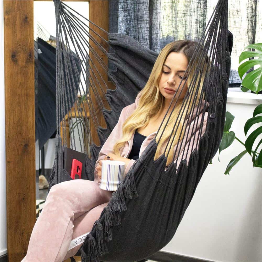 Hamacele braziliene se caracterizeaza prin calitatea materialului si manopera atenta.Pernele incluse in set completeaza perfect intregul produs, datorita caruia ne putem odihni in aer liber sau in interior in confort deplin.Fabricat din materiale naturale, inclusiv bumbac, asigura o permeabilitate maxima la aer si o calitate ridicata a produsului.Materialul usor si foarte durabil se adapteaza la corp, astfel incat balansarea pe el este confortabila si sigura.Hamacul are bucla pentru agatat, care va permite sa alegeti individual unde sa il agatati.Dupa pliere, ocupa putin spatiu, iar greutatea maxima permisa de utilizare este de 150 kg. Caracteristici: Dimensiuni: 130×100 cm Lungimea barei: 100 cm Diametrul tijei: 3.3 cm Greutate maxima admisa: 150 kg Material: 65% bumbac + 35% poliester 2 perne confortabile Franjuri decorativi Culoare: gri inchis Principalele avantaje: Ingrijirea si calitatea lucrarii Material moale si durabil Se potriveste perfect corpului Permeabilitate maxima la aer Instalare in orice loc