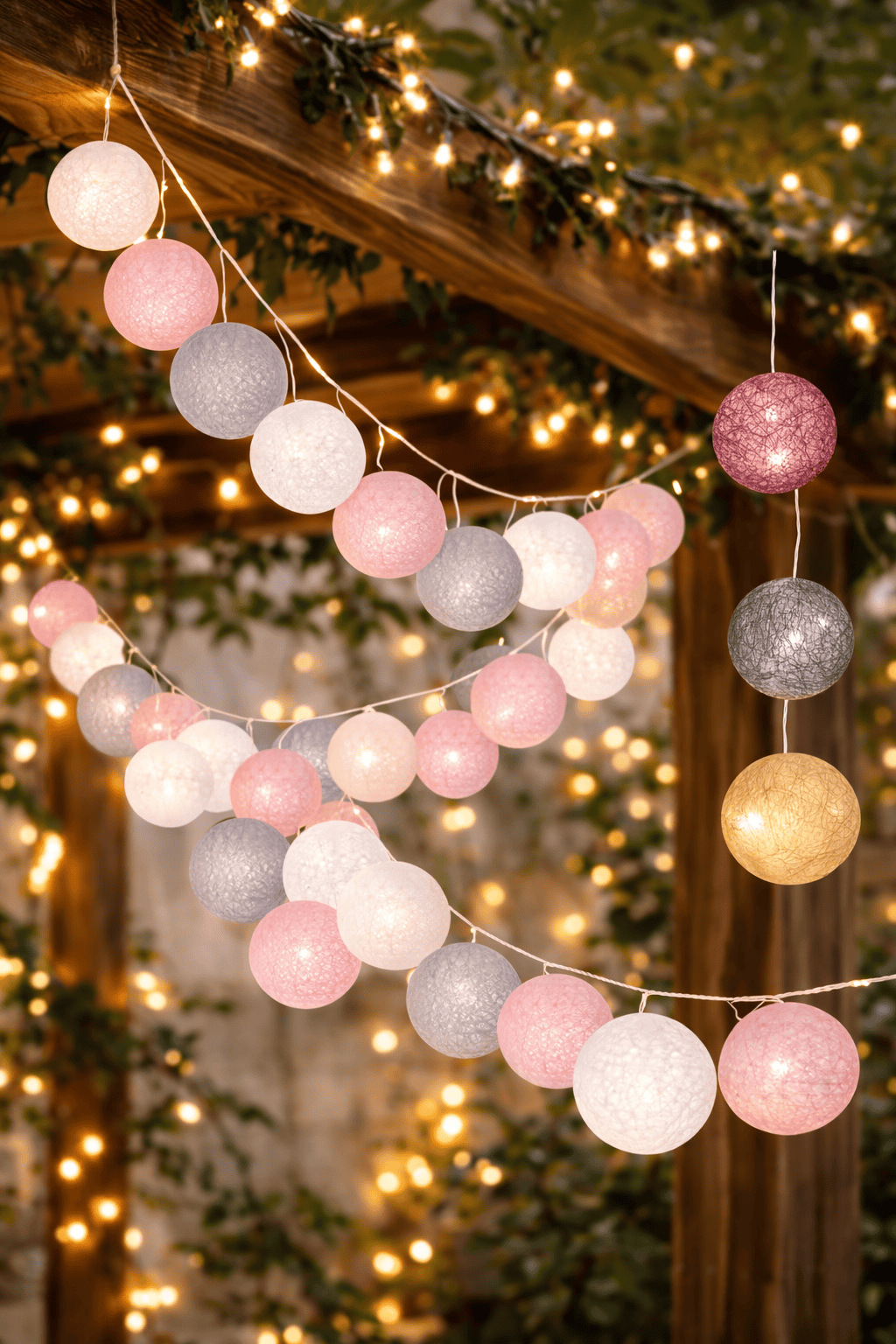Instalatie decorativa 20 LED, lumina alba calda, 4.1 m, bile roz/alb/gri Mob360 – produs disponibil în magazinul Mob360.