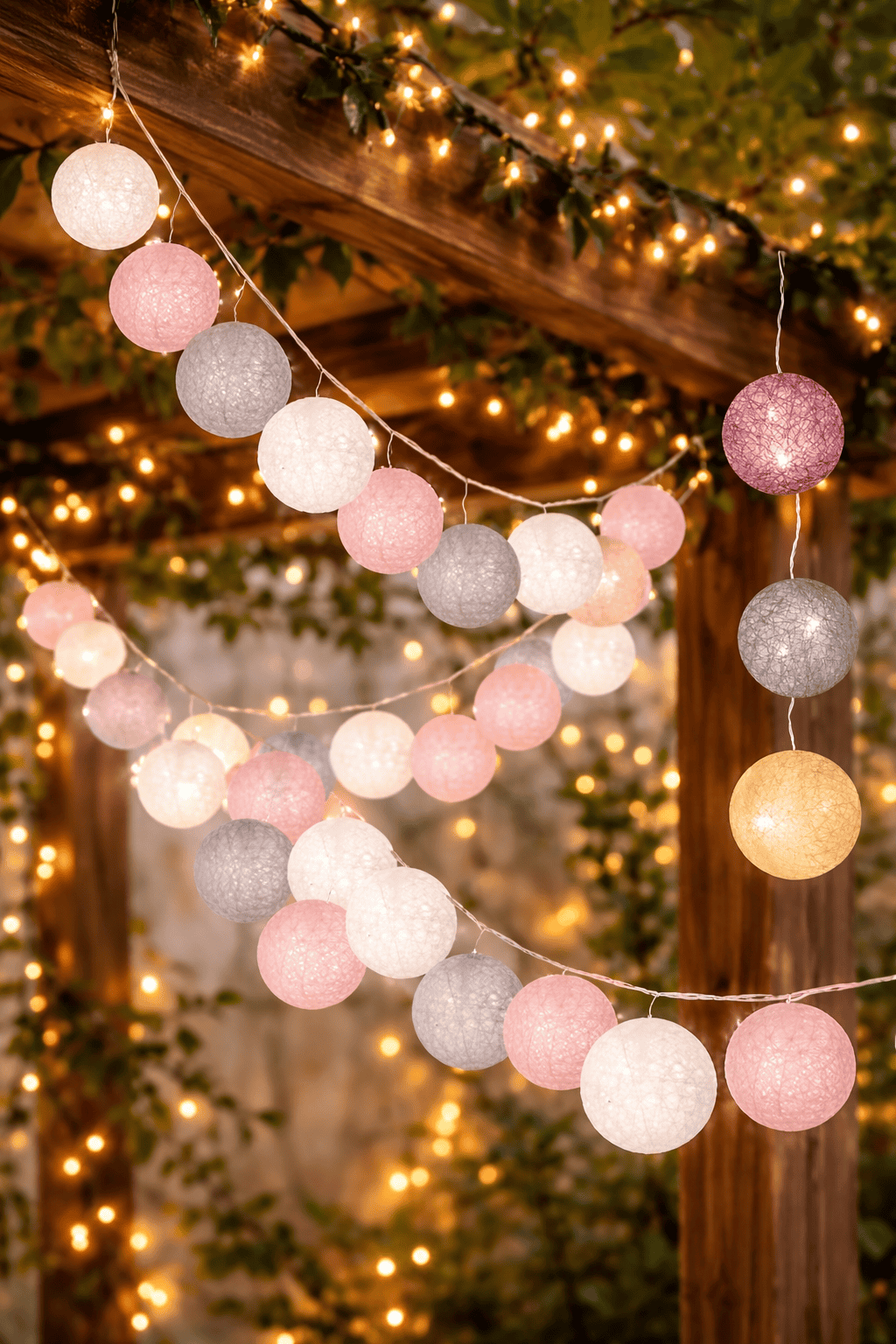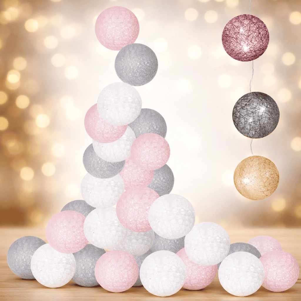 Instalatie decorativa 30 LED, lumina alba calda, 6.1 m, bile roz/alb/gri Mob360