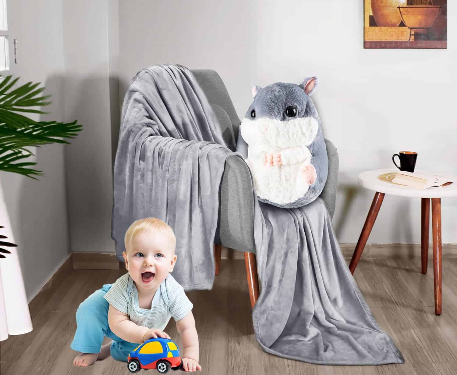Jucarie plus hamster cu paturica ascunsa, plus moale pentru copii, 50×28 cm, gri Mob360 – produs disponibil în magazinul Mob360.