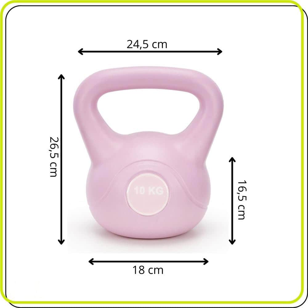 Specificatii tehnice Culoare: roz Material exterior: ABS durificat Material interior: ciment Greutate: 10 kg Diametru bila: aprox. 18 cm Latime totala: 24,5 cm Inaltime totala: aprox. 26,5 cm Inaltime bila: 16,5 cm Circumferinta bila: 65 cm Distanta maner–bila: aprox. 8 cm Latime interioara maner: 17 cm Diametru maner: 4 cm Lungime maner: 24,5 cm Circumferinta maner: 13 cm Scurta descriere Cu o greutate de 10 kg, acest kettlebell este potrivit pentru antrenamente de forta intensa si exercitii functionale solicitante. Constructia robusta din ABS durificat si umplutura din ciment asigura stabilitate si control optim in timpul executiei. Ideal pentru cresterea fortei si a rezistentei, atat acasa, cat si in sala. Caracteristici principale Greutate 10 kg pentru antrenamente intense Constructie rezistenta din ABS durificat Umplutura din ciment pentru echilibru stabil Maner ergonomic pentru prindere sigura Control bun in exercitii dinamice Potrivit pentru antrenament functional si forta