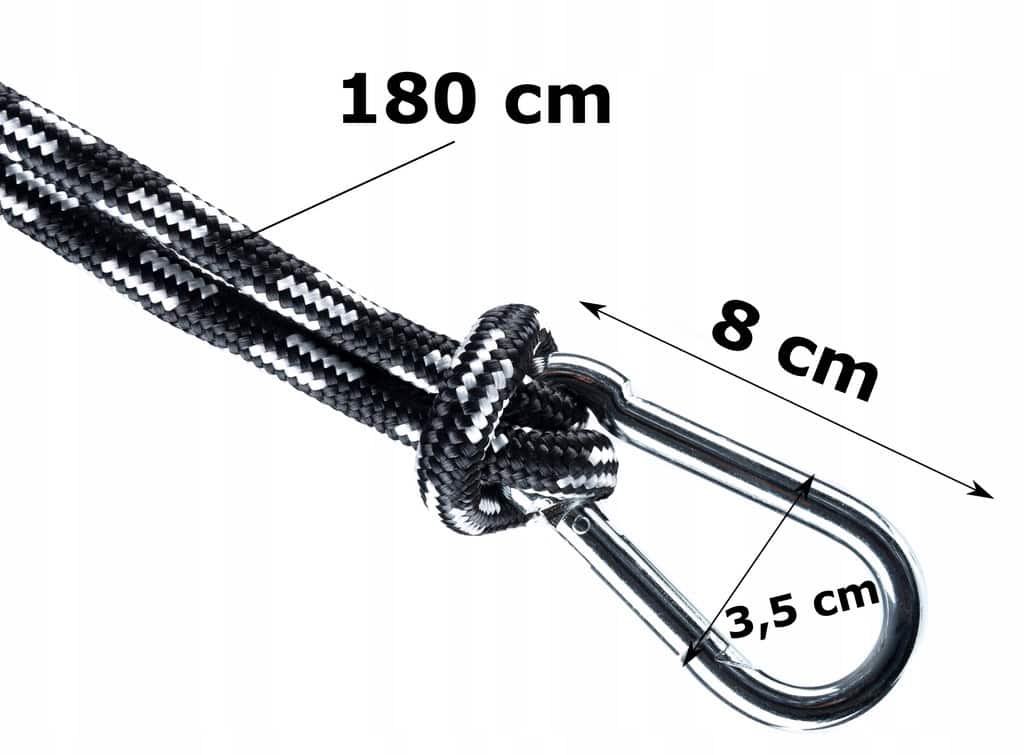 - Un kit de fixare a hamacului format din doua franghii rezistente cu carabineAtasare robusta . Montati-va hamacul, leaganul, scaunul brazilian, cuibul de barza etc. rapid si fara efort. Specificatii: lungimea franghiei: aprox. 180cmdiametrul franghiei: aprox. 9mmrezistenta setului: 2x200kglungimea carabinierului: 8cmdiametrul carligului: aprox. 7,7mmsetul include 2 bucati