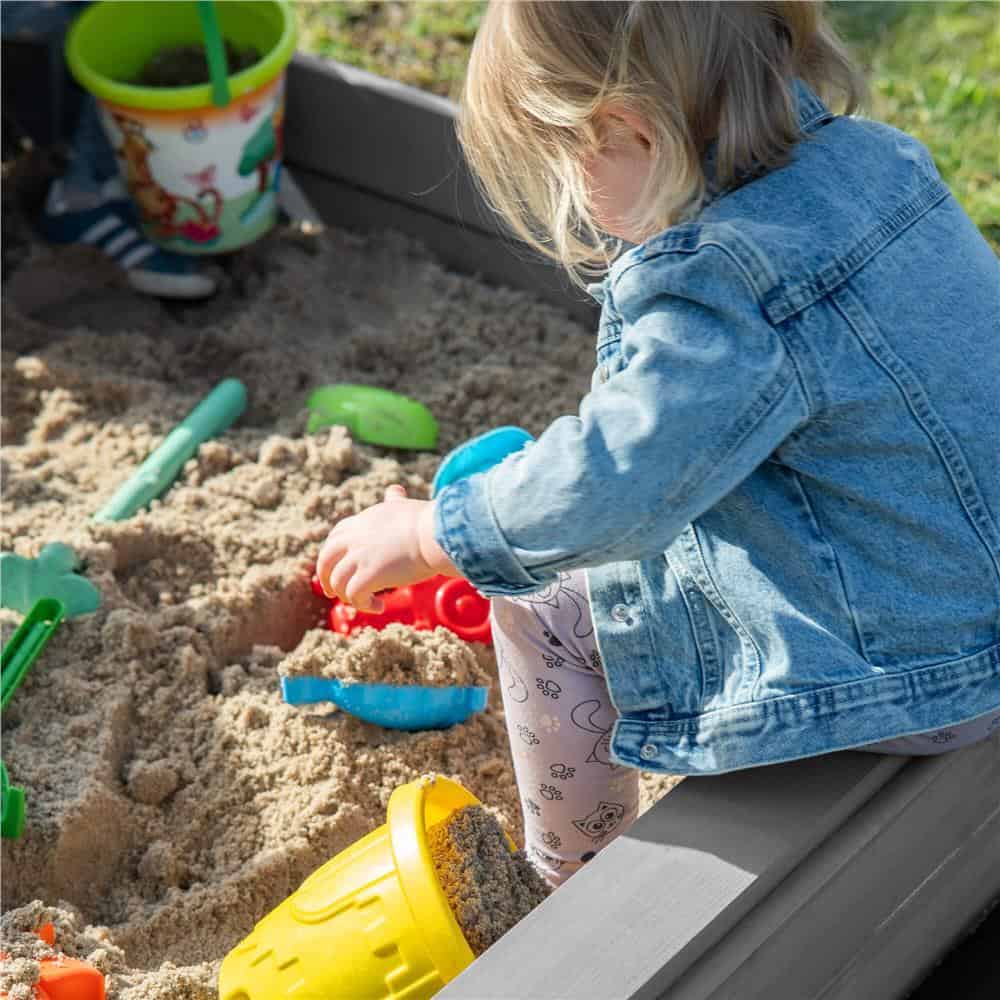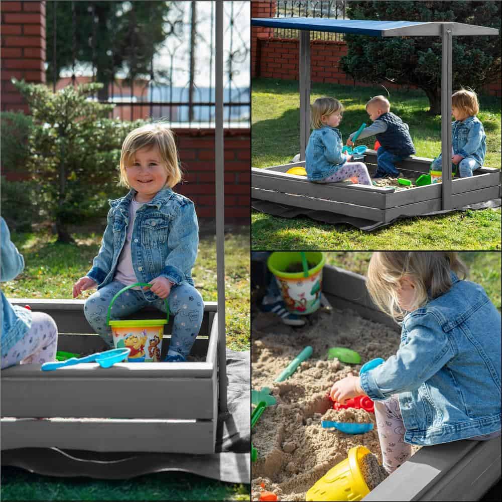 Specificatii tehnice: Tip produs: Lada de nisip cu baldachin si capac Material: Lemn de conifere tratat ecologic Culoare lemn: Gri Culoare acoperis: Albastru inchis Certificare: CE Potrivit pentru: Copii peste 18 luni Dimensiuni exterioare: 120 x 120 x 120 cm Inaltime bancute: 20 cm Dimensiuni baldachin: 120 x 120 cm Grosime scanduri: 1,8 cm Latime scanduri: 8,5 cm Latime sezut: 8,5 cm Dimensiuni geotextil (inclus): 150 x 160 cm Capacitate aproximativa: 240 litri Greutate estimata: ~13-15 kg Accesorii incluse: Geotextil negru, set montaj complet Functii: Acoperis reglabil, inchidere completa, bancute laterale fara spatar Scurta descriere: Aceasta lada de nisip din lemn masiv este alegerea ideala pentru gradina sau curte. Echipata cu baldachin reglabil si bancute laterale, asigura un loc sigur si placut pentru joaca. Poate fi inchisa dupa utilizare pentru a proteja nisipul. Produs fabricat in Polonia, finisat cu grija si certificat CE pentru siguranta copiilor. Caracteristici principale: Lemn tratat ecologic, rezistent la intemperii Acoperis textil ajustabil pentru umbra si protectie Functie de inchidere – capac rabatabil din bancute Include geotextil pentru izolarea solului Marginile sunt rotunjite pentru siguranta copiilor Design compact, usor de integrat in gradina Capacitate de pana la 240 litri de nisip Certificare CE – sigur pentru copii Montaj facil cu gauri preforate Cadou perfect pentru zile de nastere sau vara