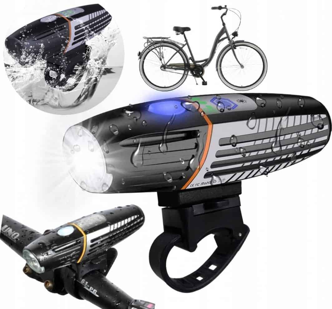 Lumina LED pentru bicicleta, impermeabila, de inalta calitate, cu indicator al nivelului bateriei. Dispozitivul imbunatateste siguranta biciclistului in timpul mersului. Caracteristicile produsului: Suport universal pe o curea de silicon. Grad de protectie: IP65 – rezistent la praf si ploaie. Sursa de alimentare: baterie de 2200 mAh. Lumina puternica: 450 lm. Indicator de nivel de incarcare a bateriei. Pana la 15 ore cu o singura incarcare (in functie de modul de functionare). Incarcare: USB 5V (adaptorul CA nu este inclus). Sursa de lumina: CREE T6 LED. Dimensiuni: 13×3,4×3,6 cm. Reglati nivelul de luminozitate cu un buton tactil. 6 moduri de lucru (apasati rapid butonul de pornire de doua ori pentru a trece la modul intermitent si SOS): lumina puternica continua. lumina slaba continua. senzor de luminozitate (dispozitivul va ajusta automat nivelul de luminozitate la conditiile meteorologice). clipire rapida. clipire lent. Semnal SOS.