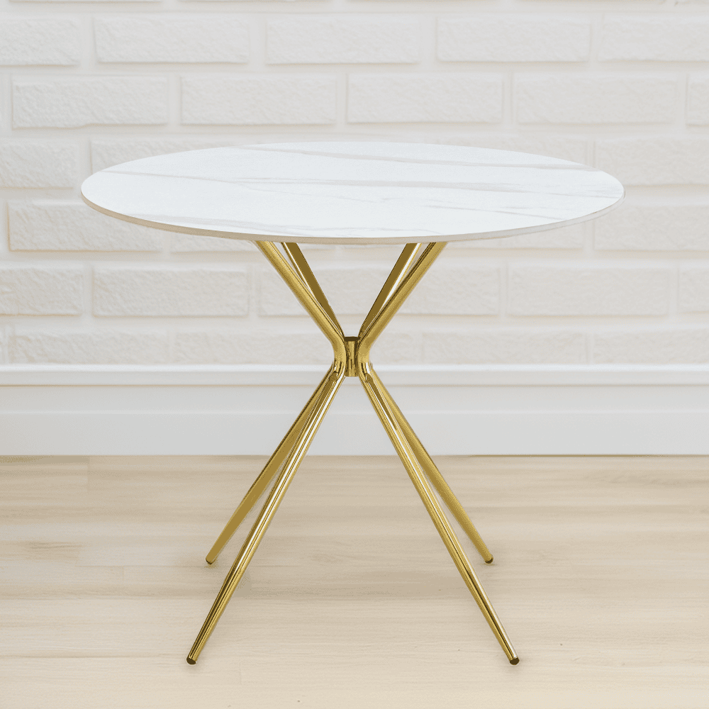 Material: placă de piatră/metal Culoare: marmură albă/gold crom auriu Dimensiuni (diametru x h): 90×75 cm Portanţa: 50 kg Grosimea blatului de piatră: 1,8 cm Rotund Pe picioare Practic Design modern Fără funcţia de extindere Se livrează dezasamblat
