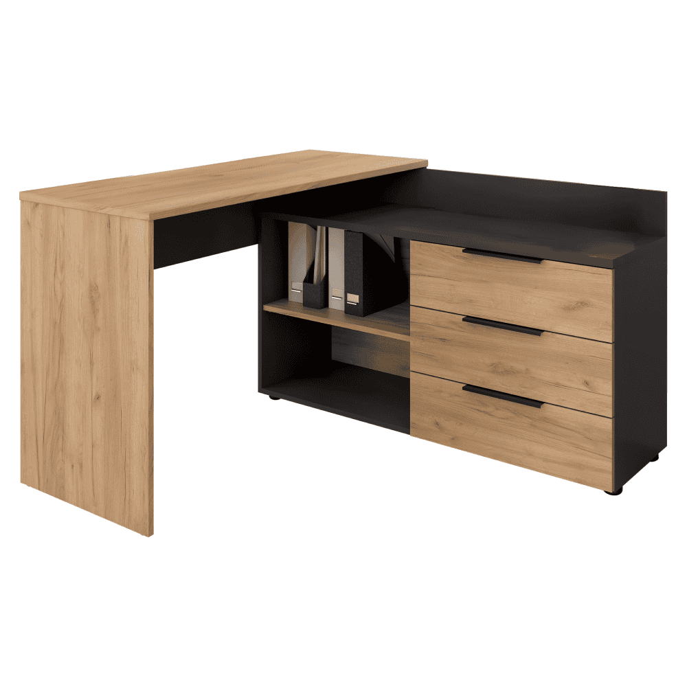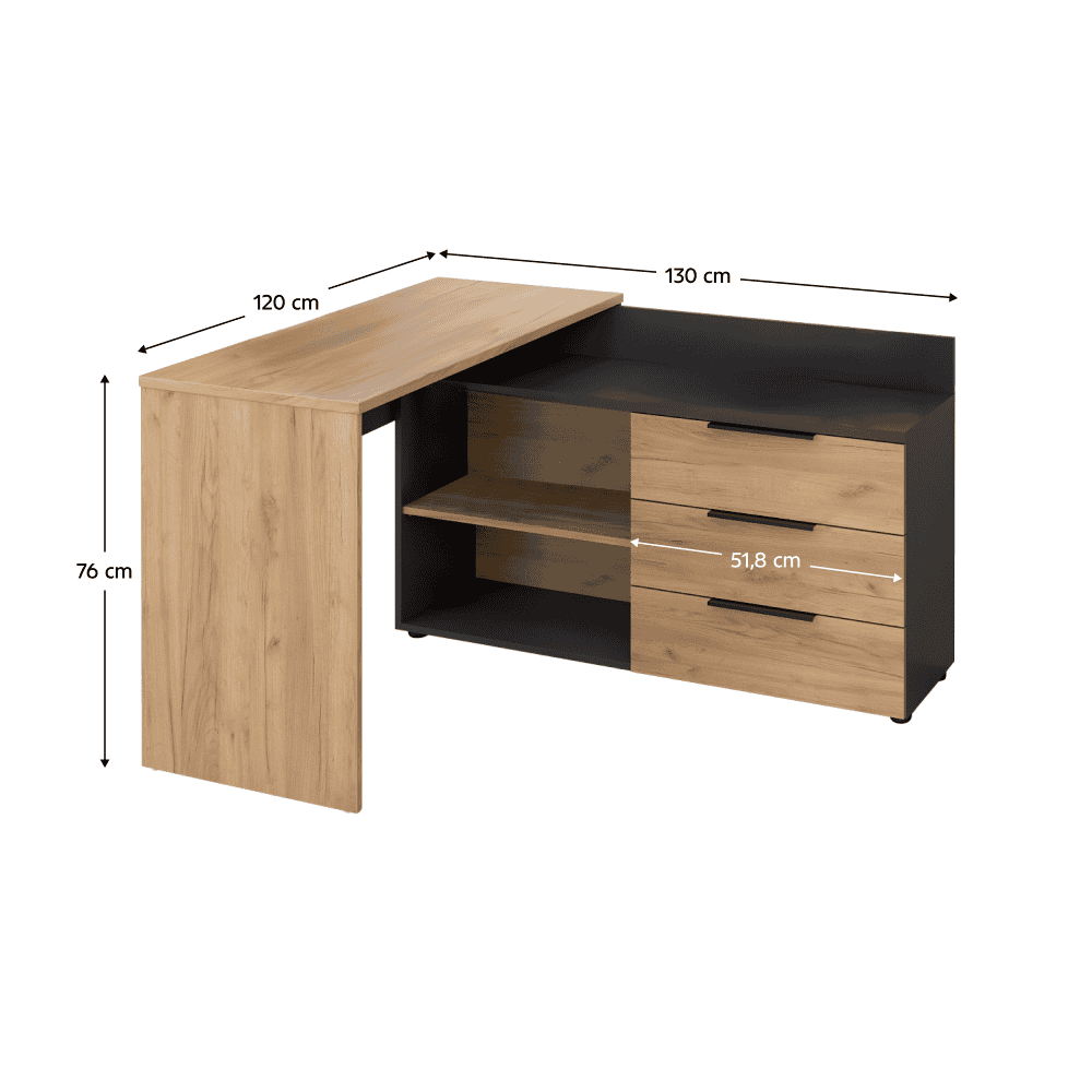 Material: DTD laminat Culoare: stejar artisan Dimensiuni (Lxlxh): 120x130x76 cm Dimensiunea blatului mesei (Lxh): 120×50 cm Grosime material: 1,6-2,2 cm Spaţiu de depozitare deschis Trei sertare Dimensiunile sertarului (Lxh): 51,8×33,3 cm Portanţă sertar: 5 cm Cu poliţe Portanţa poliţei: 5 kg Portanţa blatului mesei: 35 kg Colţ Universal Cu mânere Culoare mânere: grafit Pe picioare Picioare reglabile pe înălţime Material picioare: metal Culoare picioare: negru Înălţime picioare: 2,8-4,3 cm Greutate: 57 kg Produs slovac de calitate Livrat dezasamblat