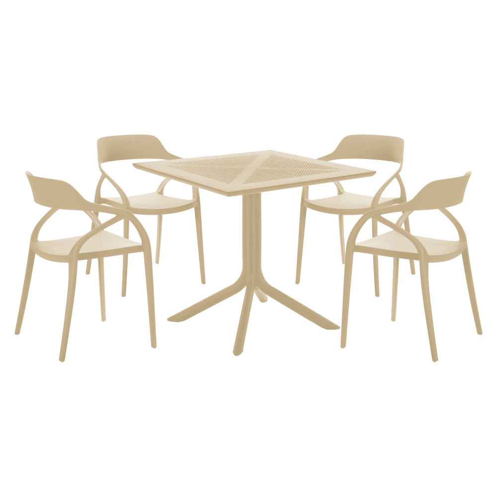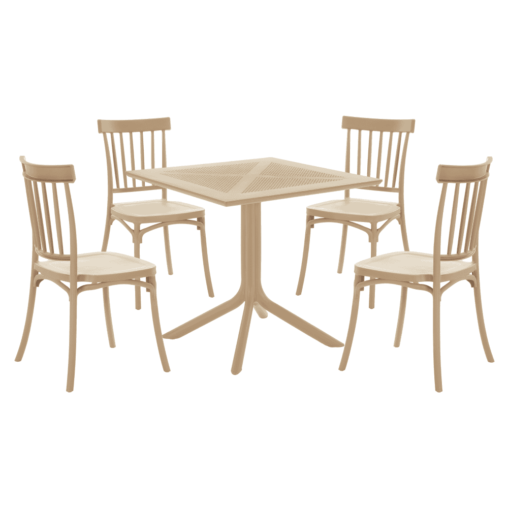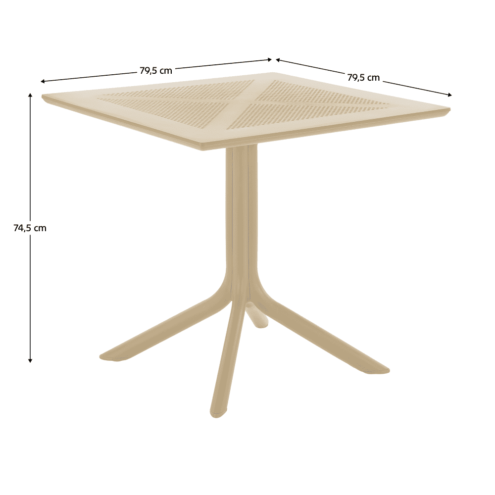 Material: plastic Culoare: gri-maro Taupe Dimensiuni (LxAxÎ): 79,5×79,5×74,5 cm Capacitate de încărcare: 50 kg Greutate: 10,5 kg Simplă Practică Pe picioare Masă de dining / grădină Potrivită pentru interior şi exterior Masă de dining pentru 4 persoane Livrată dezasamblată