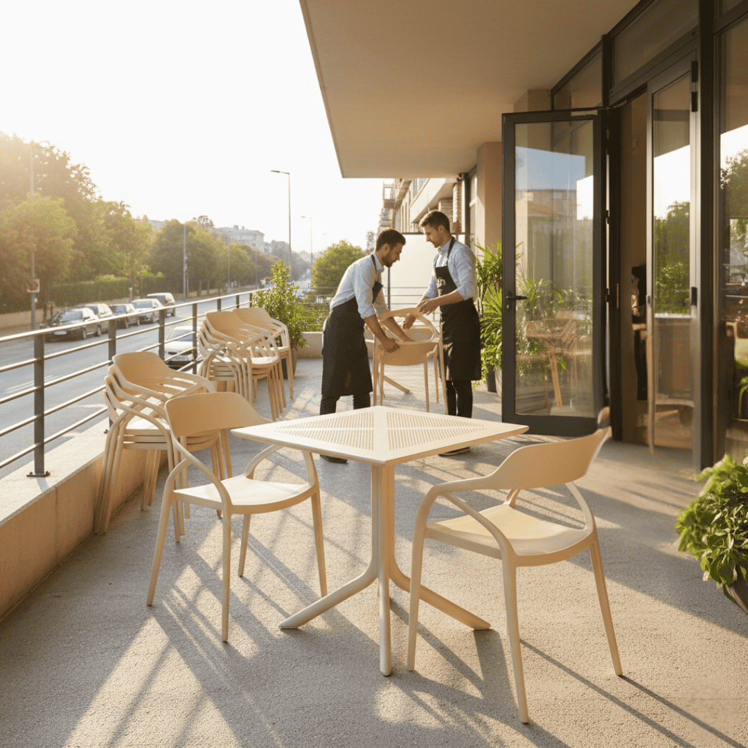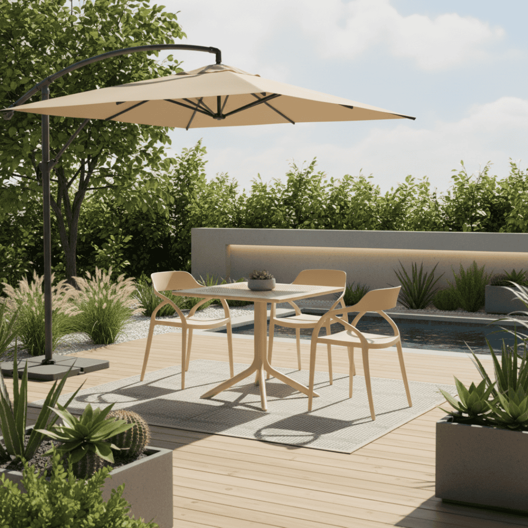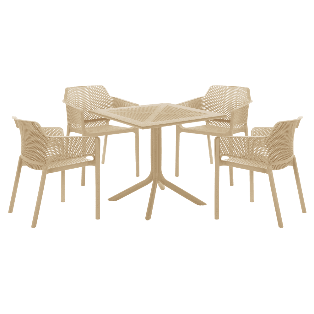 Material: plastic Culoare: gri-maro Taupe Dimensiuni (LxAxÎ): 79,5×79,5×74,5 cm Capacitate de încărcare: 50 kg Greutate: 10,5 kg Simplă Practică Pe picioare Masă de dining / grădină Potrivită pentru interior şi exterior Masă de dining pentru 4 persoane Livrată dezasamblată