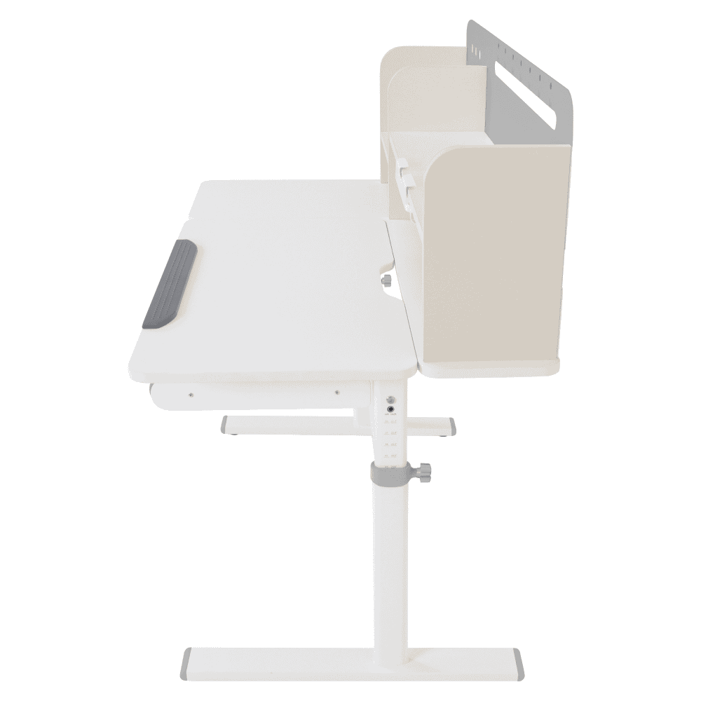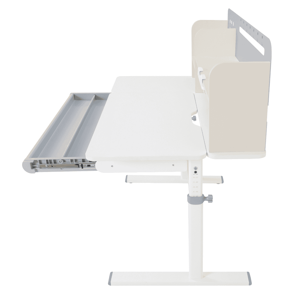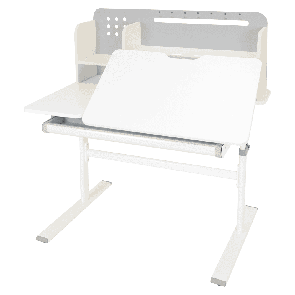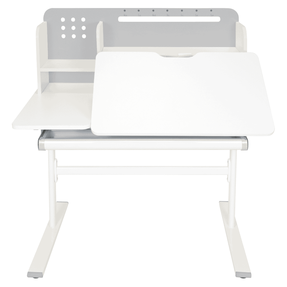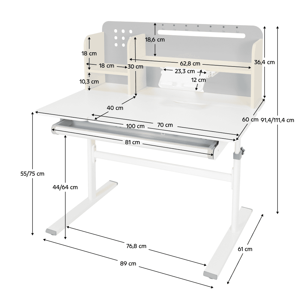 Material: MDF înfoliat / plastic / metal Grosimea materialului MDF: 1,5 cm Culoare: gri/alb Blatul mesei este cu margini ABS Dimensiunile mesei (lxAxh): 100x60x91,4-111,4 cm Dimensiunile bazei (lxA): 89×61 cm Adâncimea blatului mesei: 40 cm Înălţimea blatului de lucru: 55-75 cm Înclinare reglabilă a blatului de lucru Înclinare a blatului de lucru: 0-40 Lăţime reglabilă a blatului: 70 cm Portanţă masă: 70 kg Înălţime reglabilă a mesei Reglarea manuală a înălţimii mesei cu o manivelă Posibilitatea de a monta mânerul pe partea dreaptă sau stângă Înălţimea mesei şi înclinarea suprafeţei de lucru pot fi reglate cu ajutorul pistonului de gaz şi al pârghiei Sertar spaţios cu compartimente Portanţa sertarului: 10 kg Panoul din spate include poliţe, un suport pentru cărţi şi un orificiu pentru trecerea cablurilor Dimensiuni suport pentru cărţi (lxh): 23,3×12 cm Bandă magnetică cu marcaj de zi Potrivit de la 3 la 14 ani Pentru copii şi adolescenţi la o înălţime de 100 – 175 cm Livrat dezasamblat