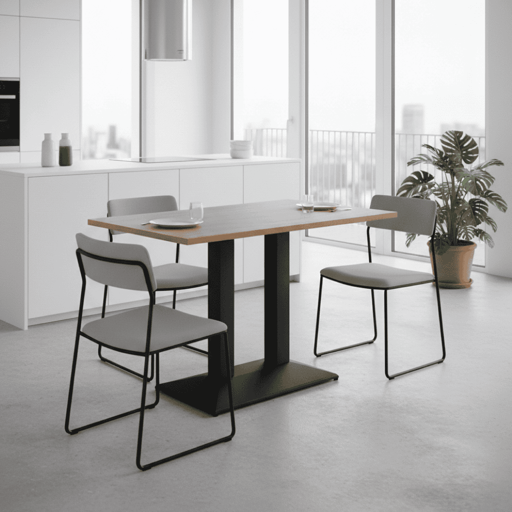 Material: DTD laminat/metal Culoare: stejar sonoma/neagră Dimensiuni (Lxlxh): 120x60x75 cm Greutate: 21 kg Grosime material: 2,3 cm Portanţă: 60 kg Bază metalică Design modern Tip masă: bistro Livrată dezasamblată